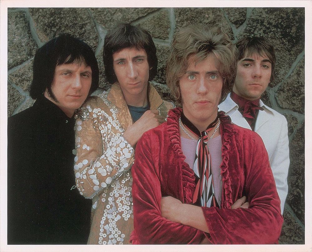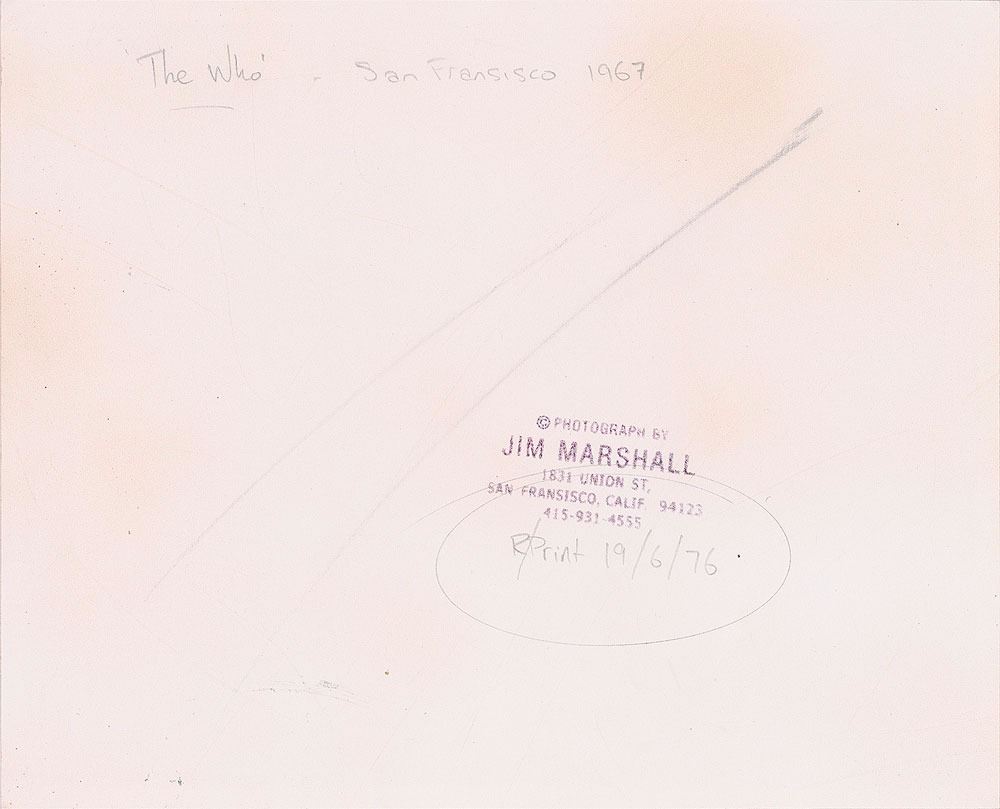 Original color semi-glossy 10.5 x 8.5 photo of The Who posing against a stone wall, taken by photographer Jim Marshall in 1967 San Francisco, with reverse bearing a Marshall copyright stamp and annotated in pencil, "R/Print 19/6/76." In very fine condition.
