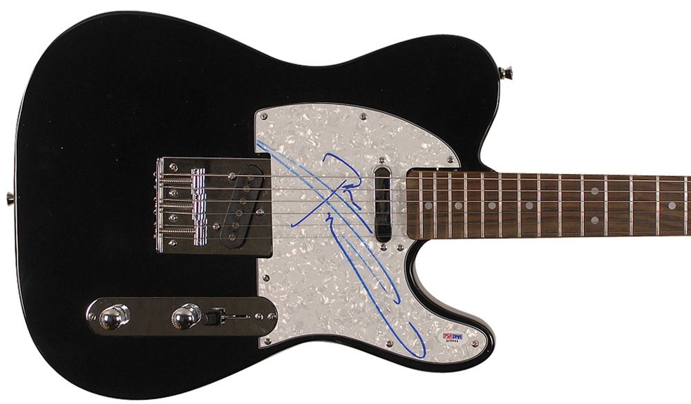 Black-bodied Stedman Pro ‘telecaster-style’ electric guitar, signed on the pearloid pickguard in blue felt tip. In fine condition, with a PSA/DNA authentication label affixed to pickguard. Accompanied by a certificate of authenticity from PSA/DNA and a photo taken at time of signing. Oversized.