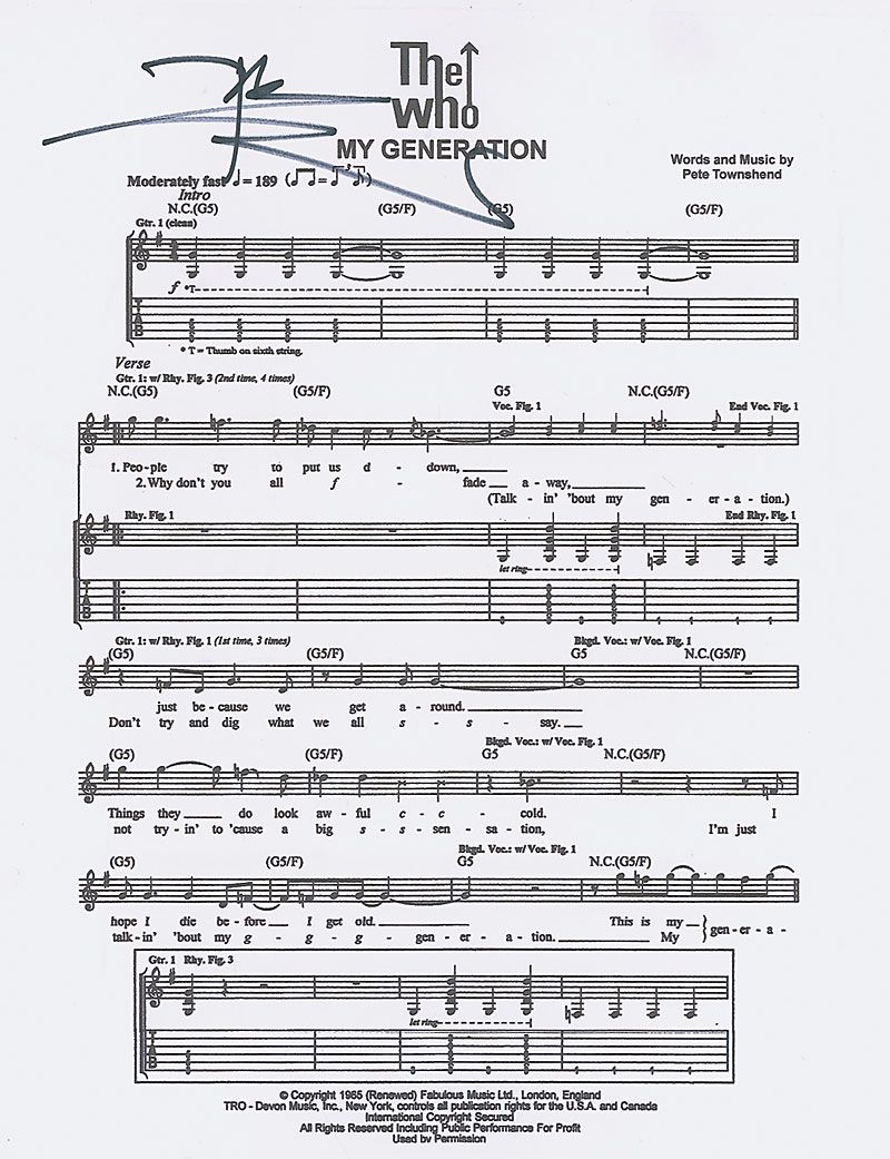 Printed sheet music to ‘My Generation,’ on seven white 8.5 x 11 cardstock pages, signed on the first page in black felt tip. In fine condition.