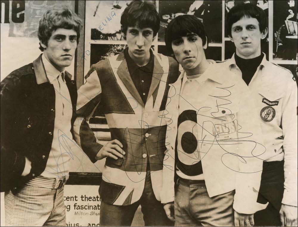 Vintage glossy black and white photo of iconic rock band The Who, signed vertically in black ballpoint by Keith Moon, John Entwistle, and Pete Townshend, and in blue ballpoint by Roger Daltrey. Inscribed ''To Angelina,'' likely in Daltrey's hand, between Daltrey and Townshend's images. Of The Who, Rolling Stone magazine aptly states, ''Along with The Beatles and The Rolling Stones, The Who complete the holy trinity of British rock.'' Measures 9.5'' x 7.25''. In near fine condition. Accompanied by PSA/DNA COA.
