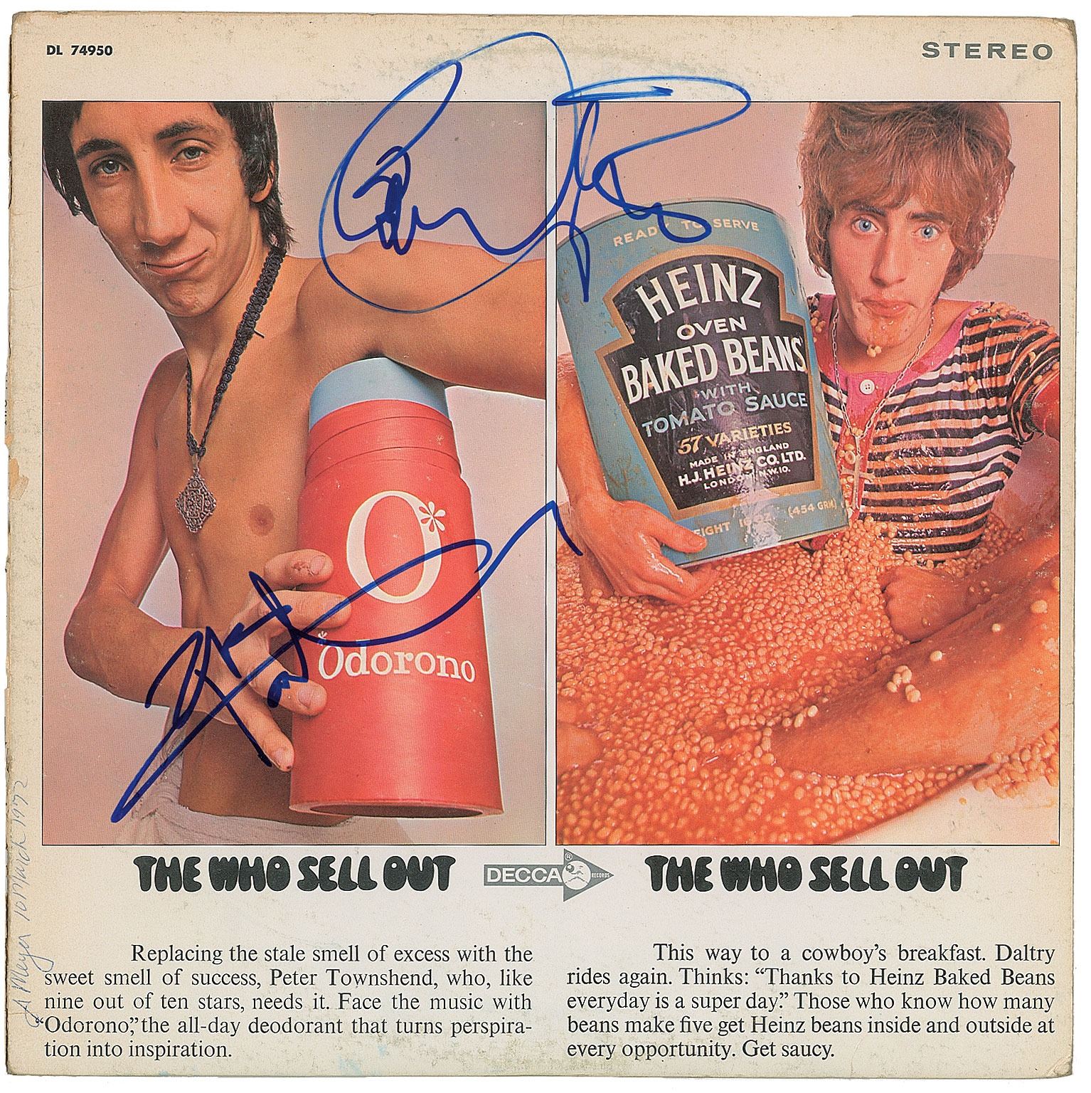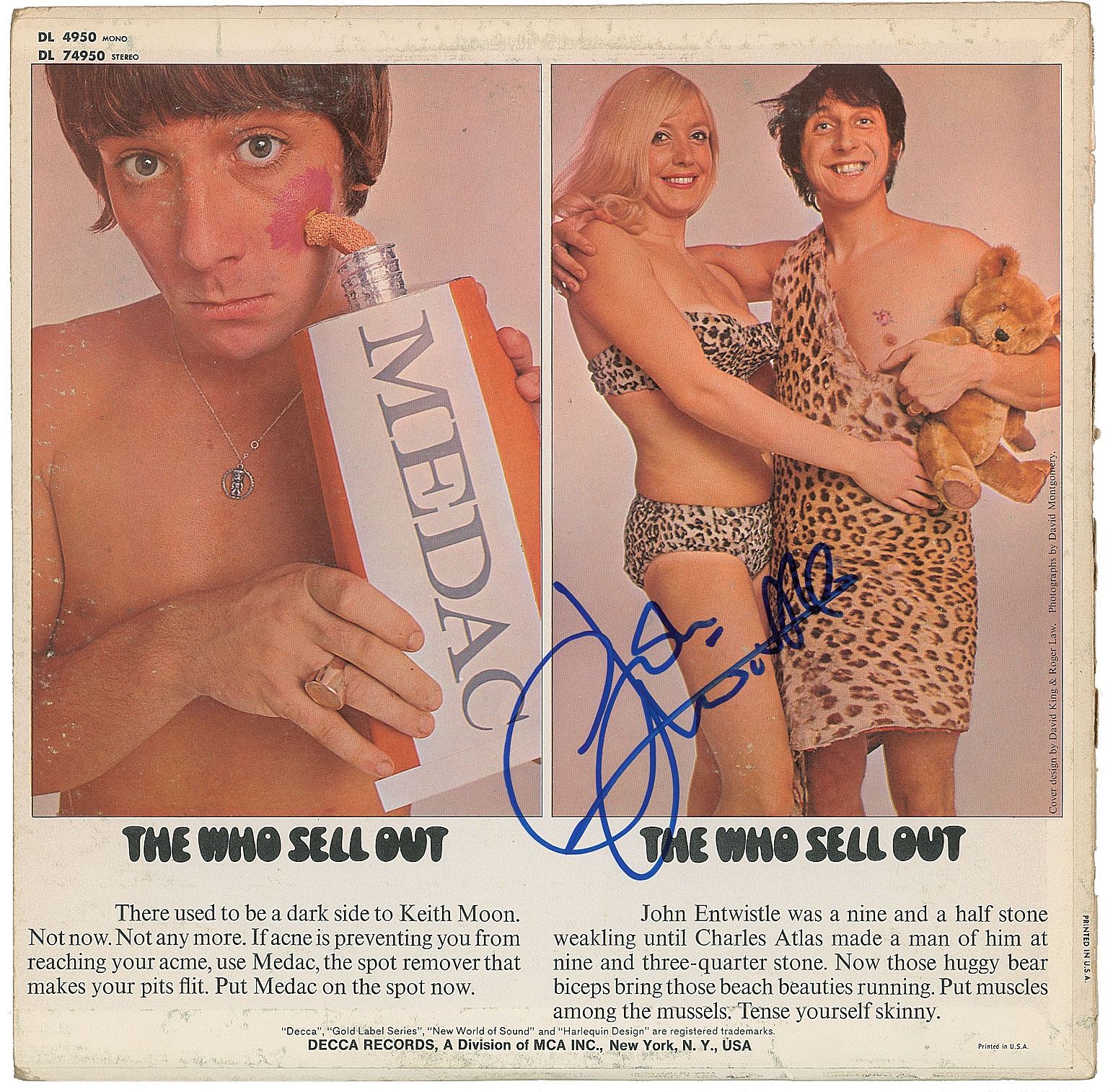 The Who Sell Out album signed on the front cover in blue felt tip by Pete Townshend and Roger Daltrey, and on the back cover by John Entwistle. In very good to fine condition, with light edge wear and scuffing, and an ownership signature along the lower left edge. The record is included.