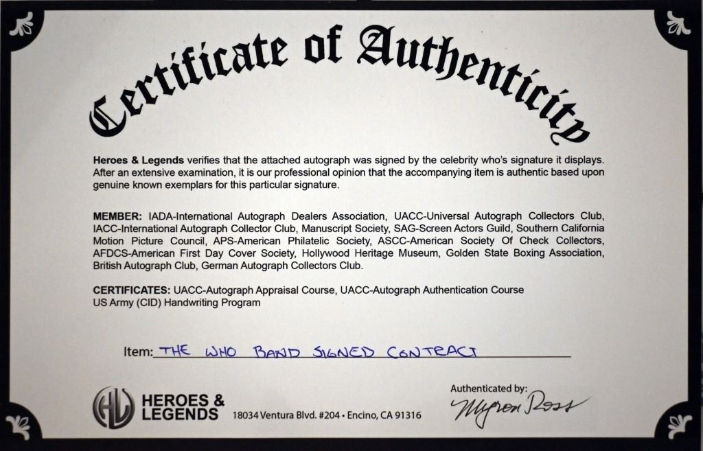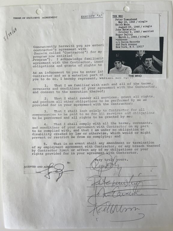 The Who signed contract autographed by Roger Daltrey, Pete Townshend, John Entwistle, Keith Moon. 9x12 inches. DB673.