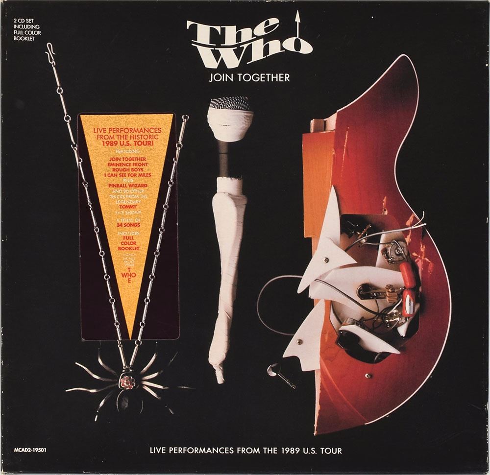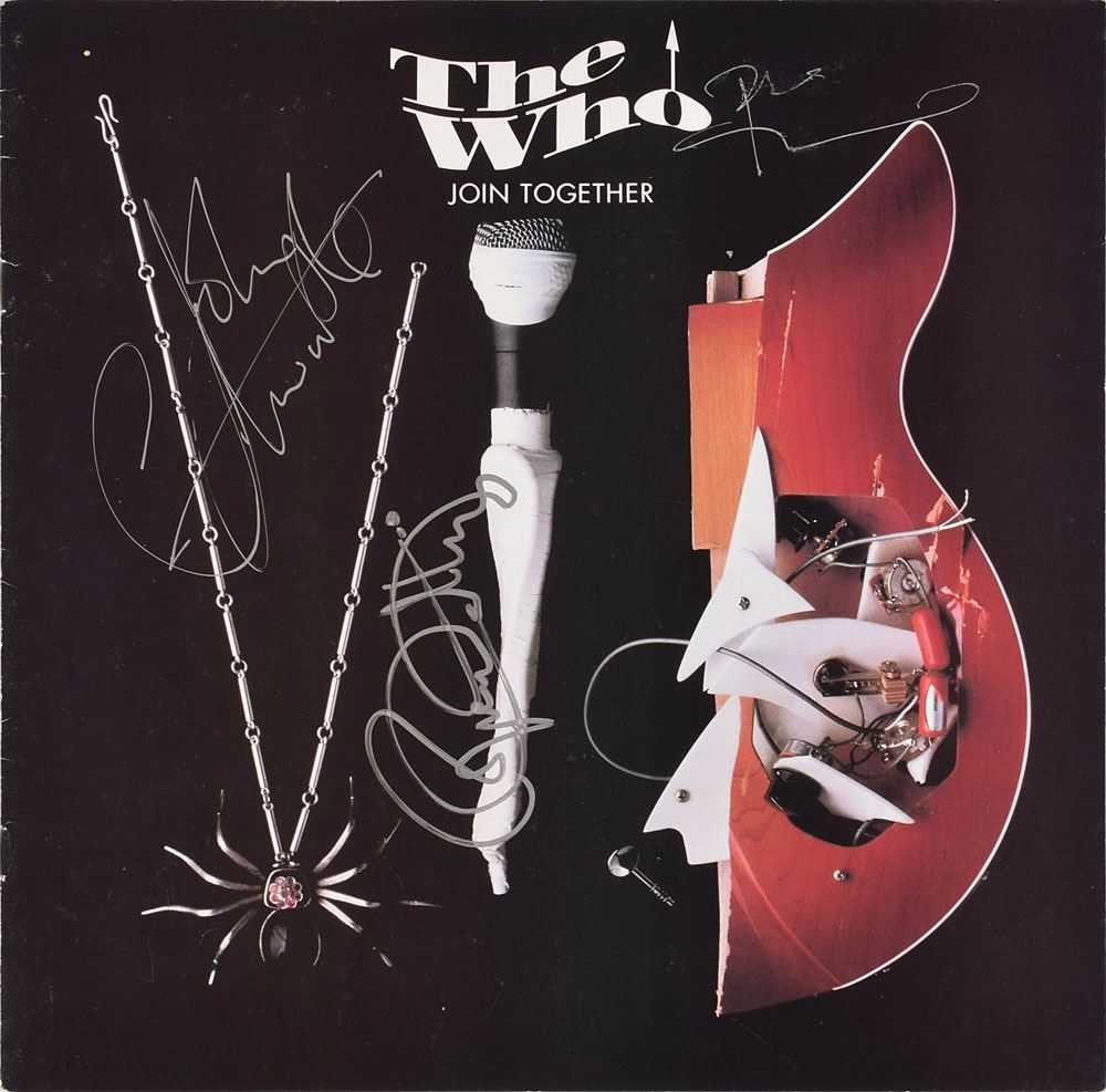 Join Together CD box set signed on the front cover of the large inner booklet in silver ink by Pete Townshend, Roger Daltrey, and John Entwistle. In fine condition, with some wear to the box and slight brushing to Townshend's signature. The CDs are included. Accompanied by a full letter of authenticity from REAL. Join Together is a two-disc box set of live material released from The Who's 1989 25th Anniversary Tour.