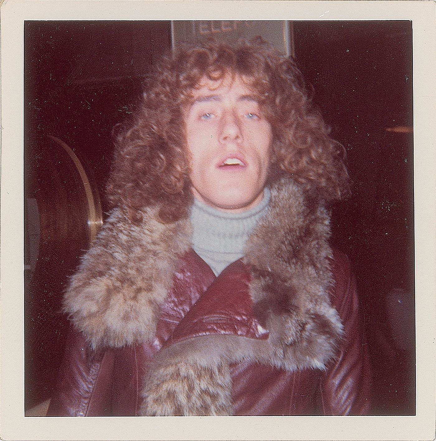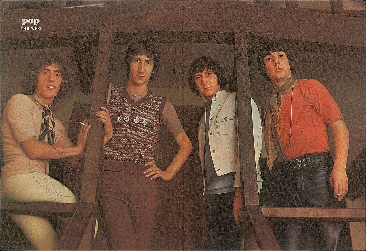 Excellent vintage color 16.25 x 11 German Pop Foto magazine centerfold of The Who, signed next to their respective images in blue ballpoint by Roger Daltrey, Pete Townshend, John Entwistle, and Keith Moon. In very good to fine condition, with moderate scattered creasing. Accompanied by two color 3.5 x 3.5 candid photos of Daltrey and Moon at the time of signing.