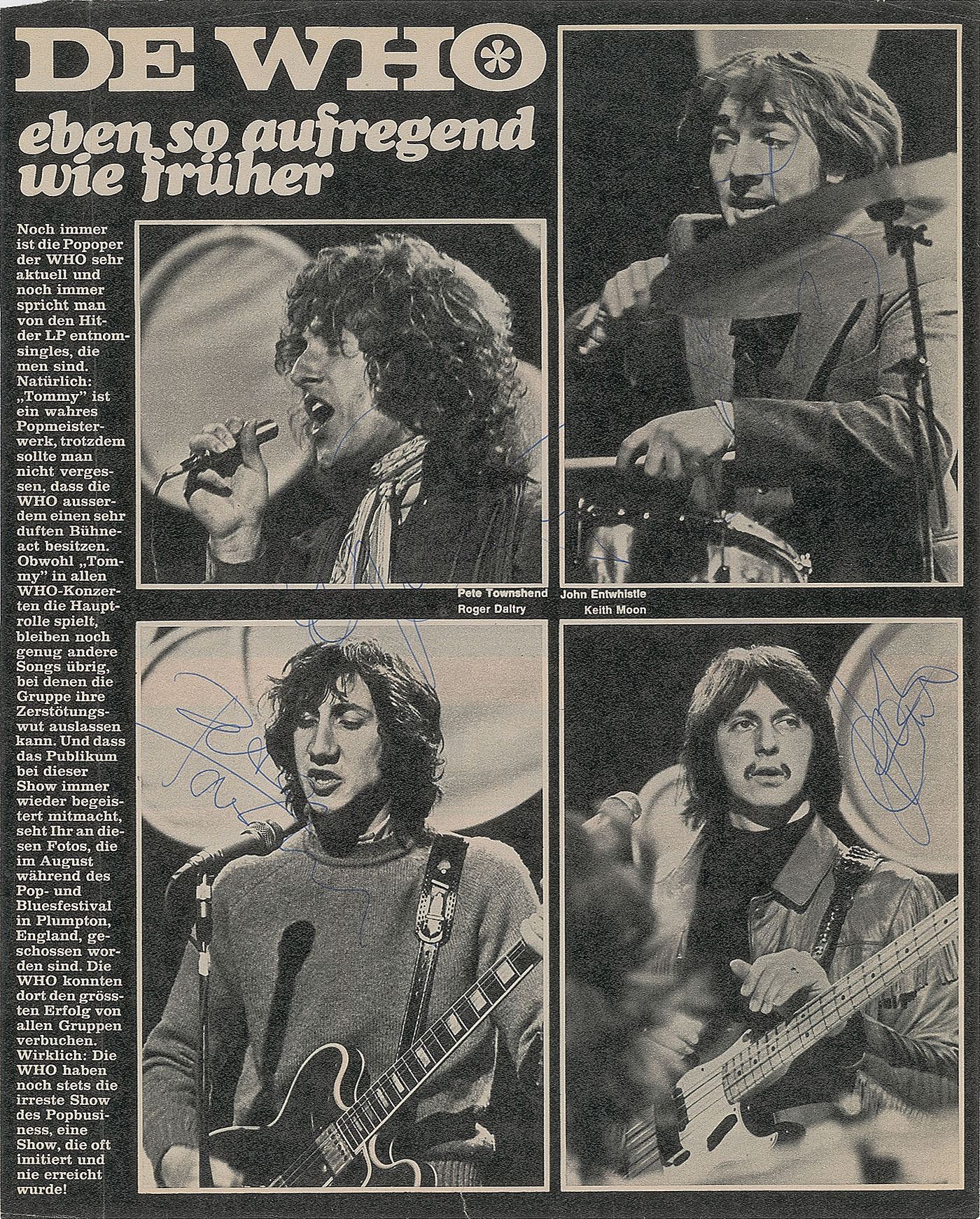 Fantastic vintage 9.5 x 12 German magazine photo of The Who, signed in blue ballpoint by Keith Moon, Pete Townshend, Roger Daltrey, and John Entwistle. In fine condition, with creasing to the left edge and corners, and very poor contrast to the Daltrey and Moon signatures. A highly desirable fully-signed piece from the iconic original lineup.