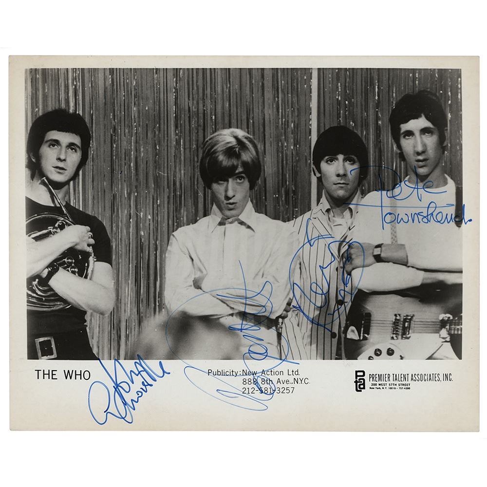 Stunning vintage glossy 10 x 8 U.S. promotional photo of The Who, an image captured by photographer Chris Morphet during a live taping of the BBC TV program Top of the Pops on September 21, 1966, signed in blue felt tip by Pete Townshend, Roger Daltrey, Keith Moon and John Entwistle. The band’s name appears along the lower border, along with the contact information for The Who’s management company, New Action, Ltd., founded by co-managers Kit Lambert and Christopher Stamp. Also included is the contact information for New York-based Premier Talent Associates, Inc. (PTA), the legendary talent agency responsible for booking many large acts of the day, including Jimi Hendrix, Led Zeppelin, and The Who. In fine condition. Accompanied by a certificate of authenticity from Tracks.