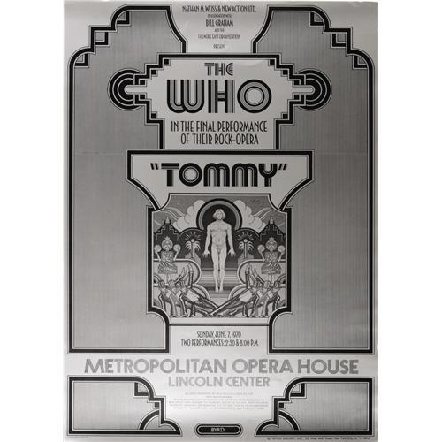 <B>The Who "Tommy Final Performance" Metropolitan Opera House Concert Poster (Nathan Weiss/Bill Graham, 1970)</B></I> It's hard to think of the term "Rock Opera" without thinking of Pete Townsend's epic song suite, "Tommy". This glamorous oversized poster, designed by artist David Byrd, was printed with metallic silver ink, advertising the "final" performance of "Tommy" by Townsend and the Who at the Lincoln Center's Metropolitan Opera House in New York. It measures approximately 18 3/16" x 26", and is in NM- condition.<BR><BR><b>Shipping:</b> Flat Material, Large (<a target="_blank" href="http://www.heritageauctions.com/common/shipping.php">view shipping information</a>)