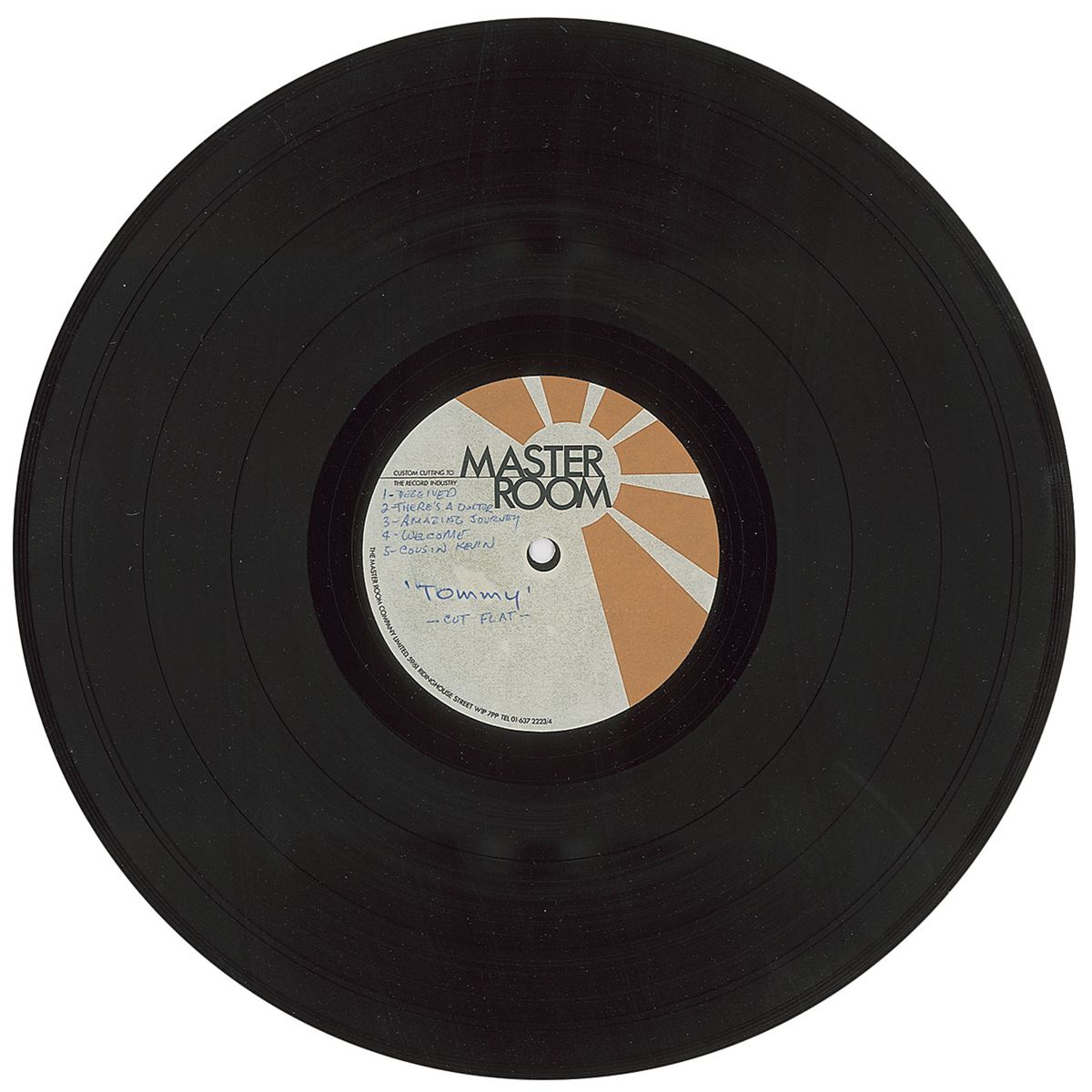 Single-sided 12? acetate of five songs from The Who’s 1975 soundtrack for Tommy, featuring ‘Deceived,’ ‘There’s a Doctor,’ ‘Amazing Journey,’ ‘Welcome,’ and ‘Cousin Kevin.’ Hand-notated on the Master Room label with the track listing as well as album info, identified as “‘Tommy,’ Cut Flat.” In fine to very fine condition. Accompanied by by the original sleeve from Master Room, which is separated at top and bottom edges.