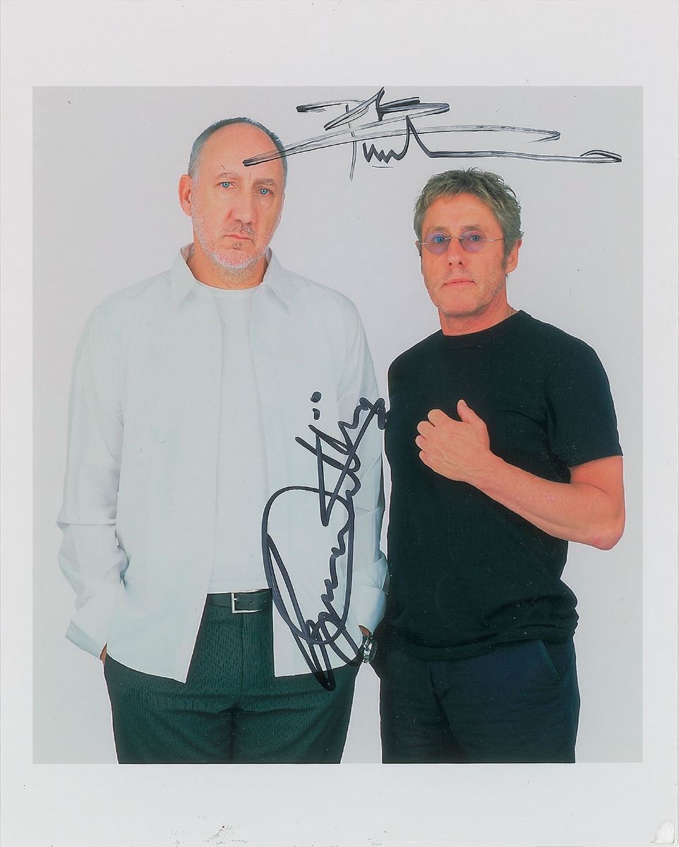 Color satin-finish 8 x 10 photo of Pete Townshend and Roger Daltrey, signed in black felt tip by both. In very good to fine condition, with scattered overall creasing and a small bit of missing emulsion to the lower right corner.