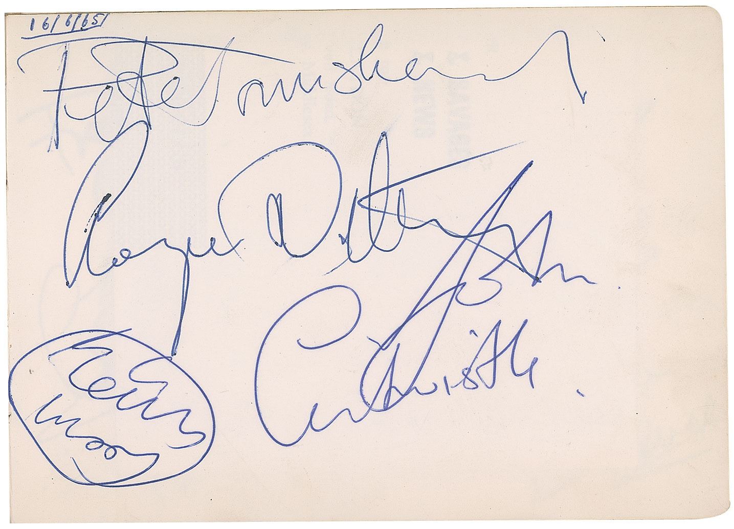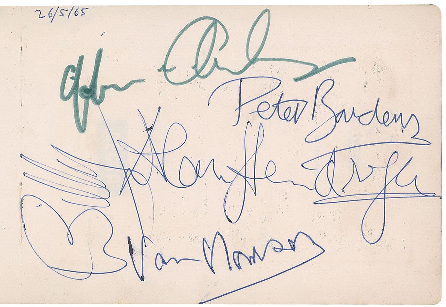 Accompanied by a provenance letter from the original recipient: "I worked at Stourbridge Town Hall from 1964 to 1967 helping out backstage and sometimes front of house. If the caretaker was not back from his meal break, I would let the groups into the building and help them set up. Fred Bannister promotions booked the top groups of the day to appear on Wednesday nights, with smaller local groups playing on Saturday nights. I met all the groups and obtained their autographs."
