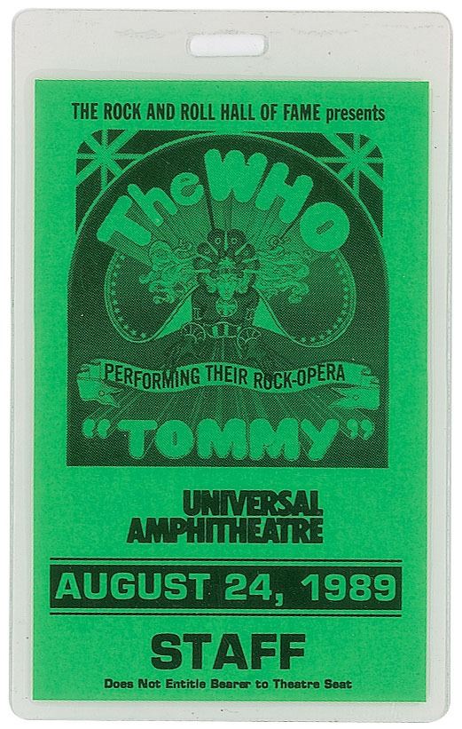 Sought-after original program for a special charity performance of the rock opera 'Tommy' by The Who at the Universal Amphitheatre in Los Angeles, California, on August 24, 1989, 64 pages, 9.75 x 11.75, containing a wide assortment of images of Roger Daltrey, Pete Townshend, and John Entwistle in celebration of the band's 25th anniversary. In addition to images of old press releases, articles, and advertisements, the program also shows pictures of the evening's special guests: Elton John, Patti LaBelle, Billy Idol, Steve Winwood, and Phil Collins. Includes the original 'Tommy' insert exclusive to the Universal Amphitheatre show, as well as the laminated bright green staff pass. In overall very good to fine condition, with general handling wear and a light vertical fold.