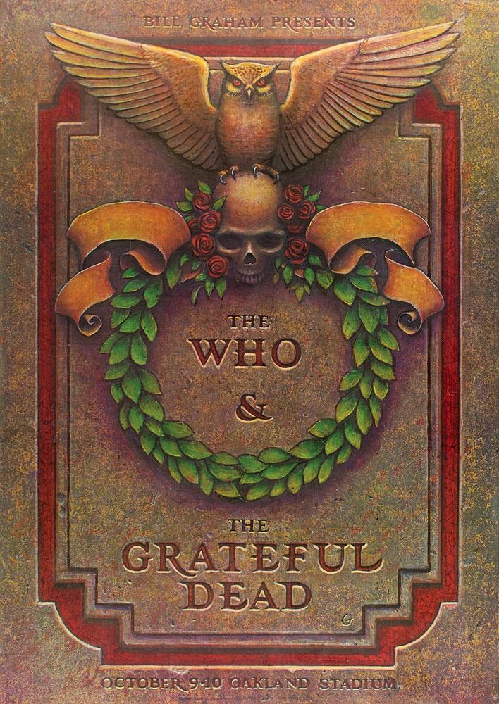 Sought-after first printing color 20.25 x 28.5 'tombstone' poster for concerts presented by Bill Graham and headlined by The Who and the Grateful Dead at Oakland Stadium on October 9 and 10, 1976. Designed by Phillip Garris, the poster depicts a tombstone with a wreath topped with a skull, roses, and owl with open wings. The lower border features the venue and date, with smaller text below reading: "1976, Bill Graham / Tea Lautrec Litho, San Francisco." Rolled and in fine condition.