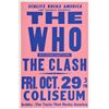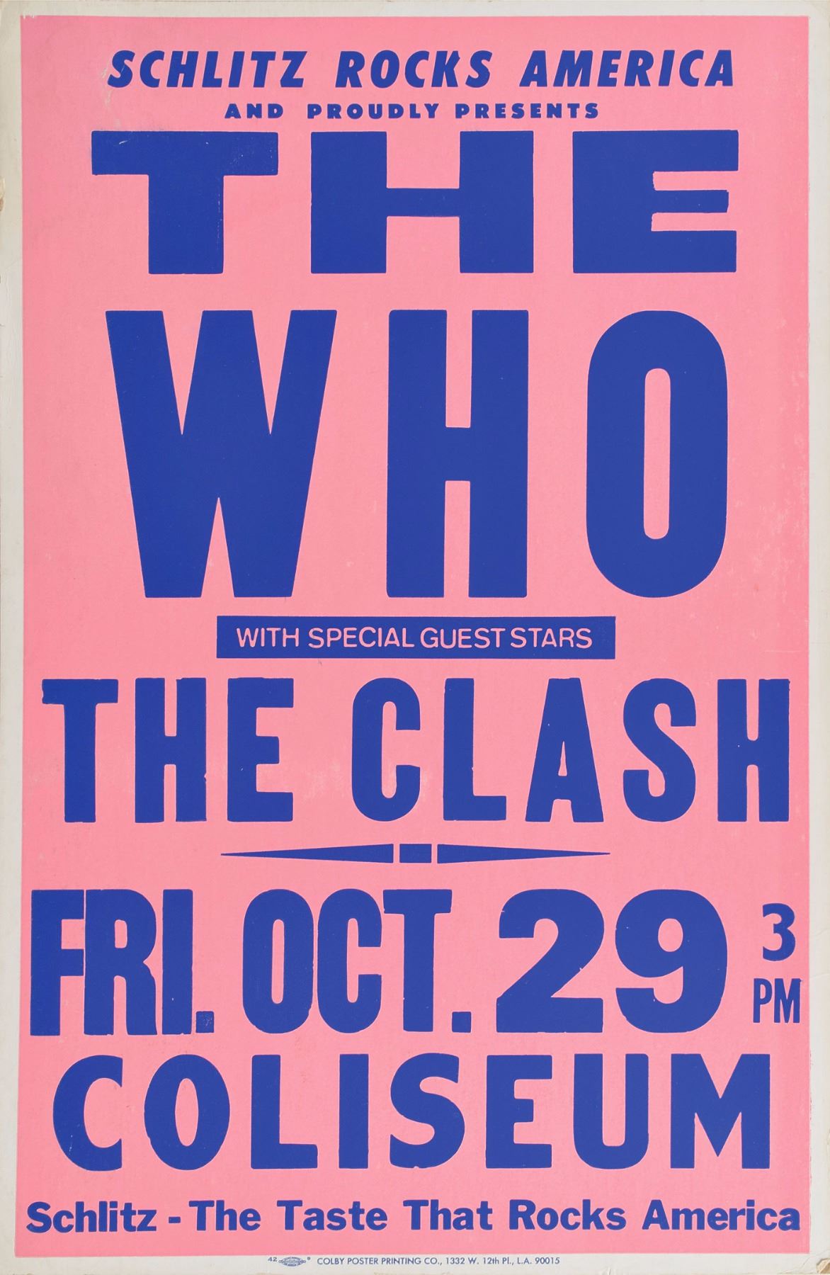 Rare 14 x 22 cardboard boxing-style concert poster advertising The Who and The Clash’s October 29, 1982 show at the Los Angeles Coliseum. Printed by Colby Posters of Los Angeles, these were posted on telephone poles around the city. This unused example was obtained from a former employee of the company hired to post them. In fine condition, with mild creasing to blank borders. After this tour, The Who announced it was their final tour, and they didn’t tour again until 1989.