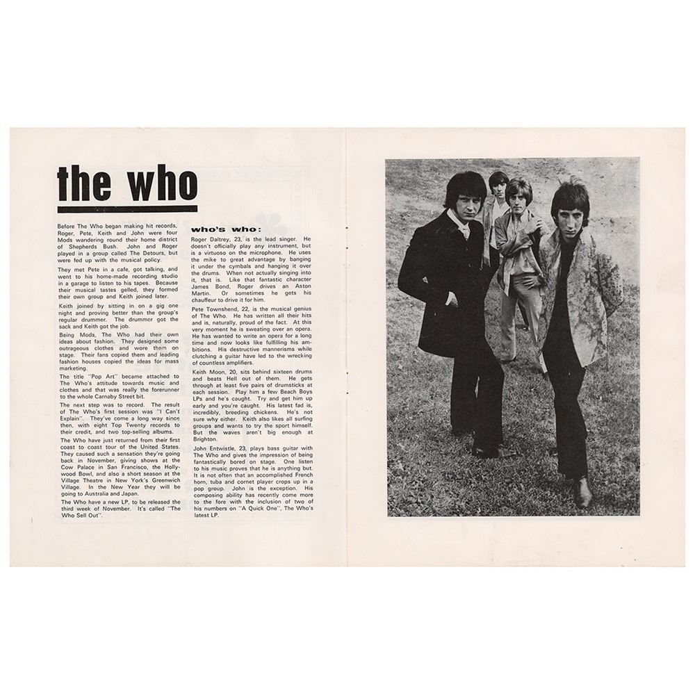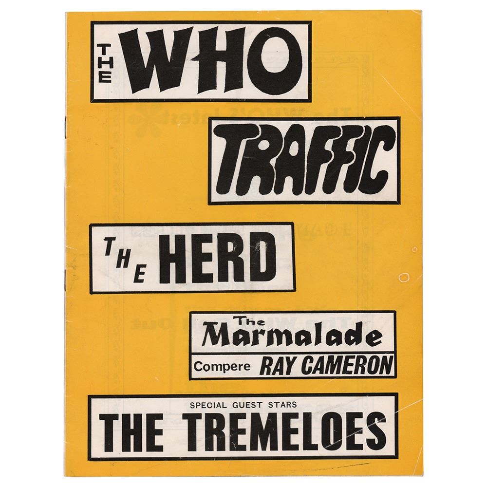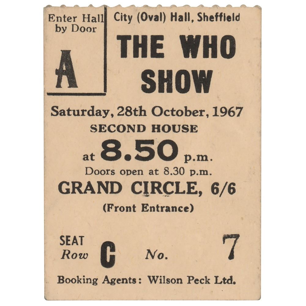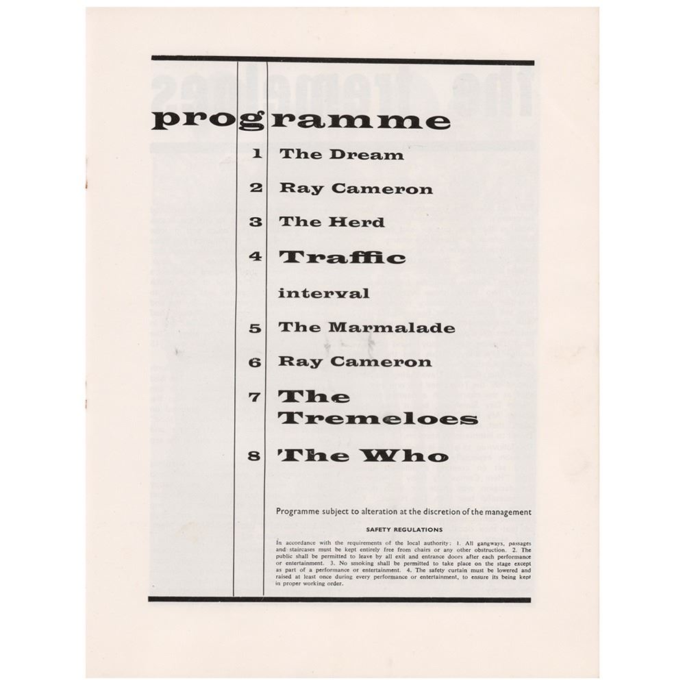 Original program for a concert headlined by The Who at Sheffield City Hall in Sheffield, England, on October 28, 1967, twelve pages, 8 x 10.5, which lists Traffic, The Herd, The Marmalade, The Dream, and The Tremeloes as the supporting acts. The program contains images and biographies for each group. Includes an original 1.75 x 2.5 ticket stub for the concert. In overall very good condition, with creasing and handling wear.