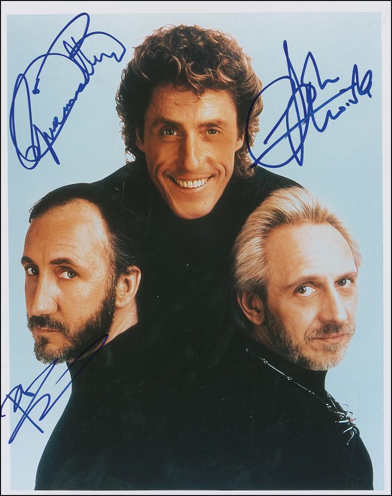Color glossy 8 x 10 head-and-shoulders photo of the band, signed in blue felt tip by Roger Daltrey, Pete Townshend, and John Entwistle. In fine condition.