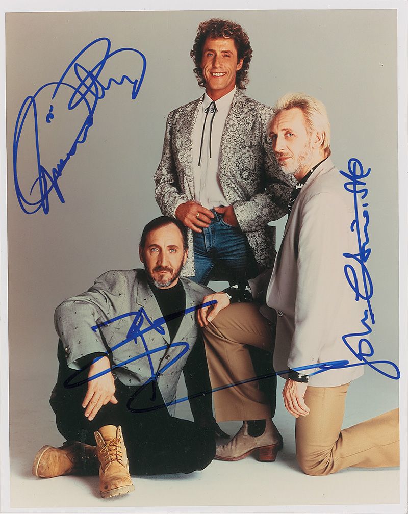 Color glossy 8 x 10 photo of the band, signed in blue felt tip by Roger Daltrey, Pete Townshend, and John Entwistle. In fine condition.