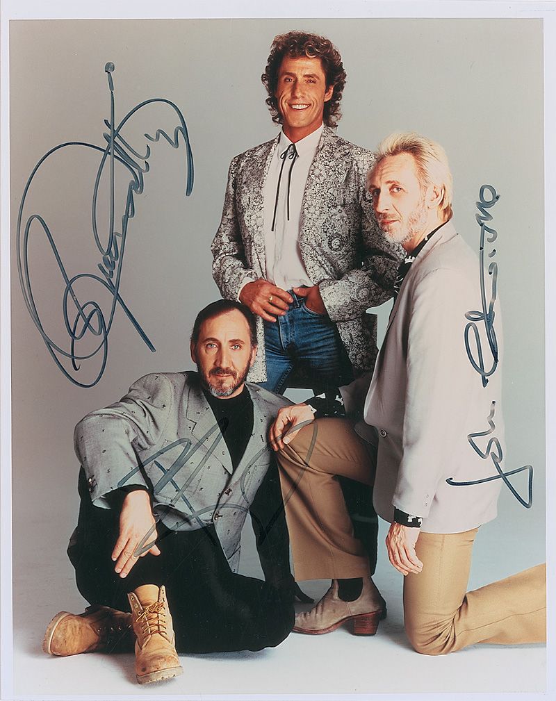 Color glossy 8 x 10 group photo, signed in black felt tip by Roger Daltrey, John Entwistle, and Pete Townshend. In fine condition, with Townshend’s signature faded, but still legible. Accompanied by a photo of each band member from the private signing.