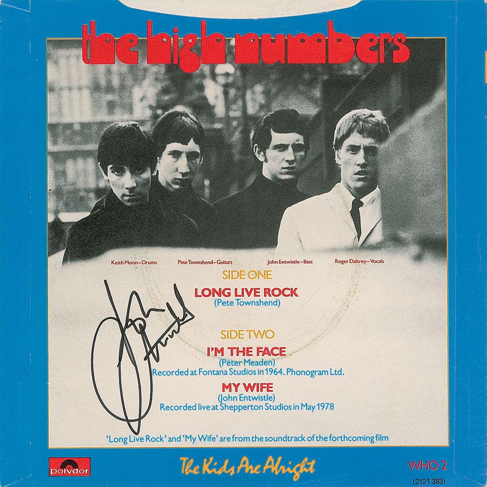 My Generation album signed on the back cover in blue ballpoint by Keith Moon and Pete Townshend and signed and inscribed to Donna in black ballpoint by Roger Daltrey. A bit of scattered light soiling to back cover and a few bends and creases to front cover, otherwise fine condition. Accompanied by a 45 rpm album sleeve for ‘Long Live Rock’ signed in black felt tip by John Entwistle. The records are not included. Consignor notes signatures were obtained by a young photo journalist who was on the set for the filming of The Kids Are All Right.