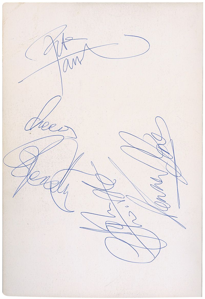 Signed book: The Who: In Their Own Words. First edition. London: Omnibus Press, 1979. Softcover, 7 x 10, 128 pages. Signed on the inside front cover in blue ballpoint by Roger Daltrey, Pete Townshend, John Entwistle, and Kenny Jones. Impressions to front cover from signatures on reverse, several other unknown signatures to inside back cover, and mild handling wear, otherwise fine condition. Accompanied by an unsigned edition of the book. Consignor notes signatures were obtained by a young photo journalist who was on the set for the filming of The Kids Are All Right.
