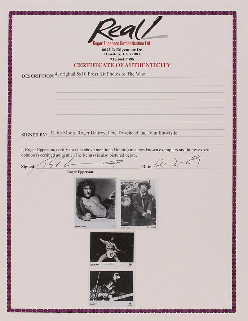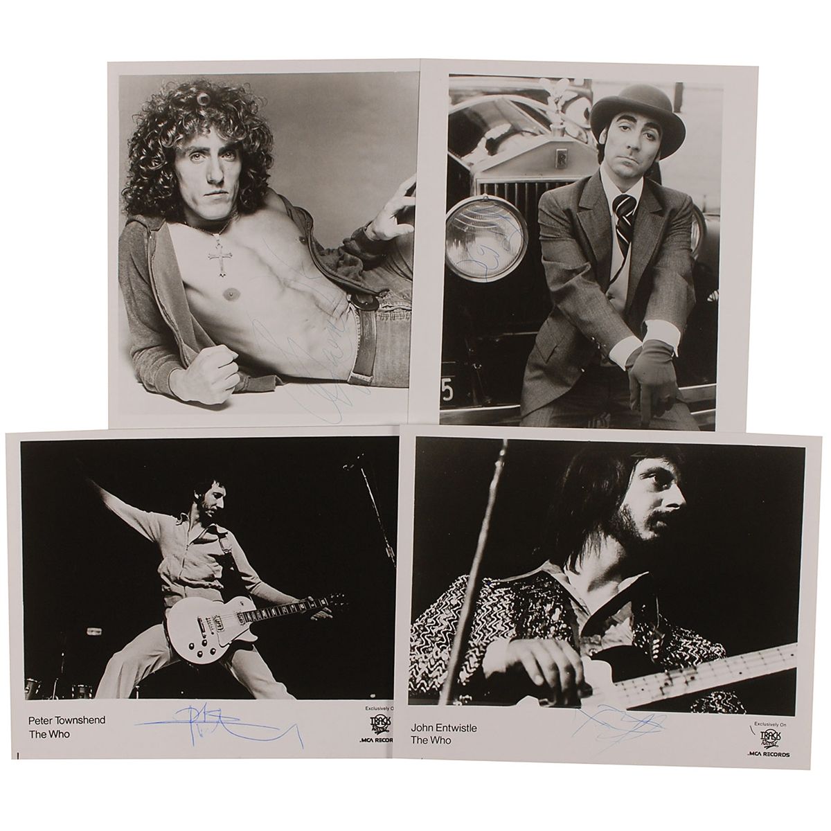Collection of four glossy Tracks and MCA Records promotional photos, two 8 x 10 and two 10 x 8, one of each of the original band members, each signed in blue ballpoint by the band member pictured: Keith Moon, John Entwistle, Roger Daltrey, and Pete Townshend. A few light bends and creases, some light skipping and irregular ink adhesion to portions of Entwistle’s signature, and a bit of light contrast to Moon’s signature, otherwise fine condition. A great collection of the original members, and any signed 8 x 10 of Moon alone is quite uncommon. Accompanied by a single certificate of authenticity from Roger Epperson/REAL for all four photos.