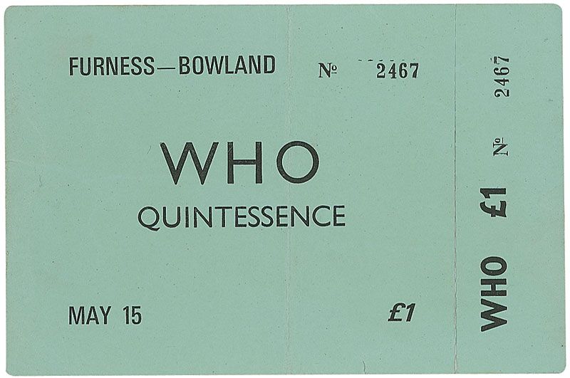 Original complete unused large format ticket, 6 x 4, for a Who concert at Furness, Bowland, Lancaster, England on May 15, 1970. The ticket has been folded vertically in the centre and laid flat. Some of the perforated edge is detached. In very good condition, with a central vertical fold, a few creases and spots of soiling, and a partial separation along perforation. Accompanied by a certificate of authenticity from Tracks.