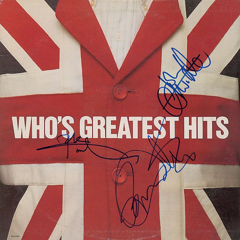 Who’s Greatest Hits album signed on the front cover in blue felt tip by Roger Daltrey, Pete Townshend, and John Entwistle. In fine condition, with mild ‘ring of wear’ to covers. The record is included. Accompanied by a full letter of authenticity from Roger Epperson/REAL.