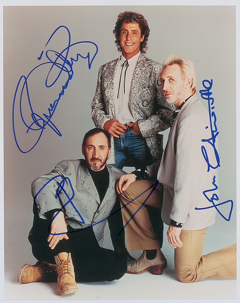 Color glossy 8 x 10 photo of The Who in recent years, signed in blue felt tip by Pete Townshend, John Entwistle, and Roger Daltrey. In very fine condition. Accompanied by a certificate of authenticity from Roger Epperson/REAL.