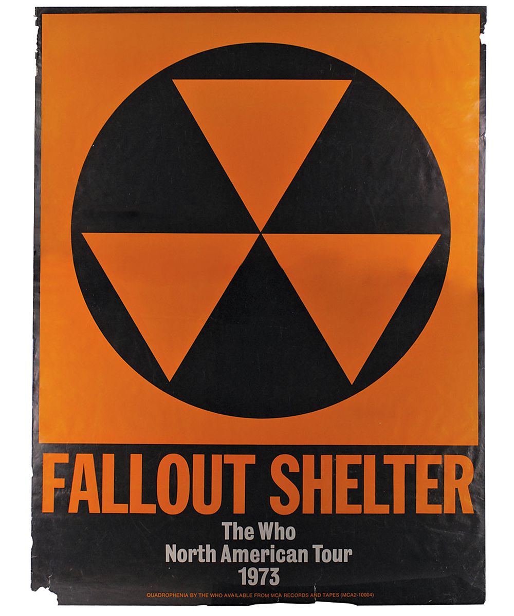 Vintage 40 x 53 tour poster for The Who’s 1973 North American tour, featuring a large ‘Fallout Shelter’ design. In very good condition, with scattered creases and noticeable edge chips and tears. Accompanied by a crew pass. The tour was in support of their newly released Quadrophenia album and only consisted of 12 shows, beginning on November 20, 1973, and ending on December 6, 1973. This brief tour meant that these posters were printed in limited supply—estimated at around 200—and because of their large size and fragile nature, few examples have survived.