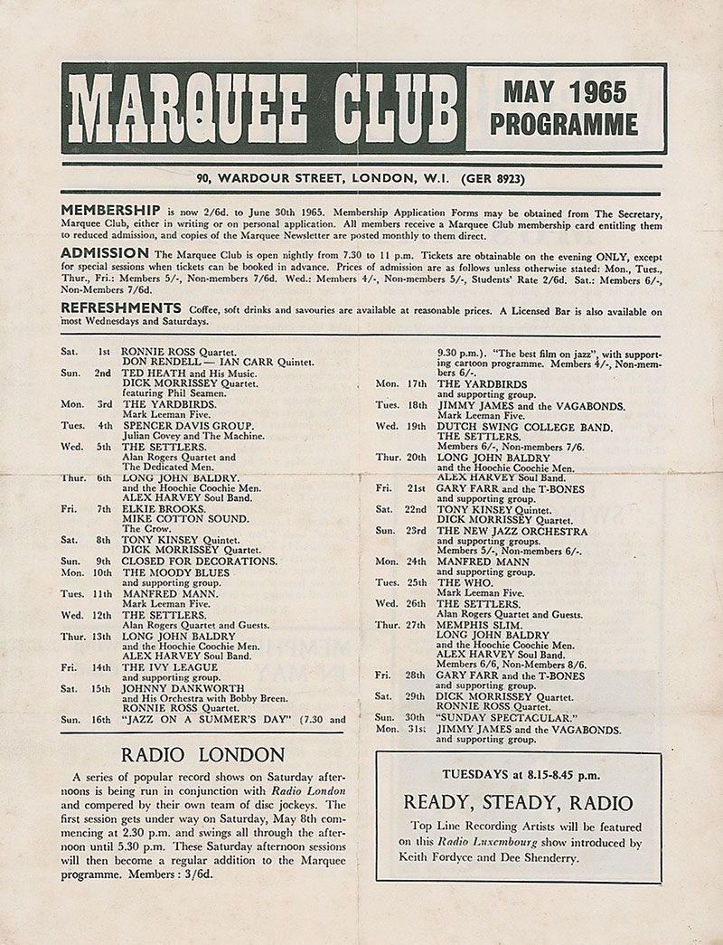 Scarce vintage double-sided handbill from the famed Marquee Club in London, 8.5 x 11, listing the shows for the month of May 1965. Shows include a very early May 25, 1965, show by the Who, as well as the Moody Blues, Manfred Mann, the Yardbirds, and the Spencer Davis Group. Intersecting folds and scattered light soiling, otherwise fine condition.