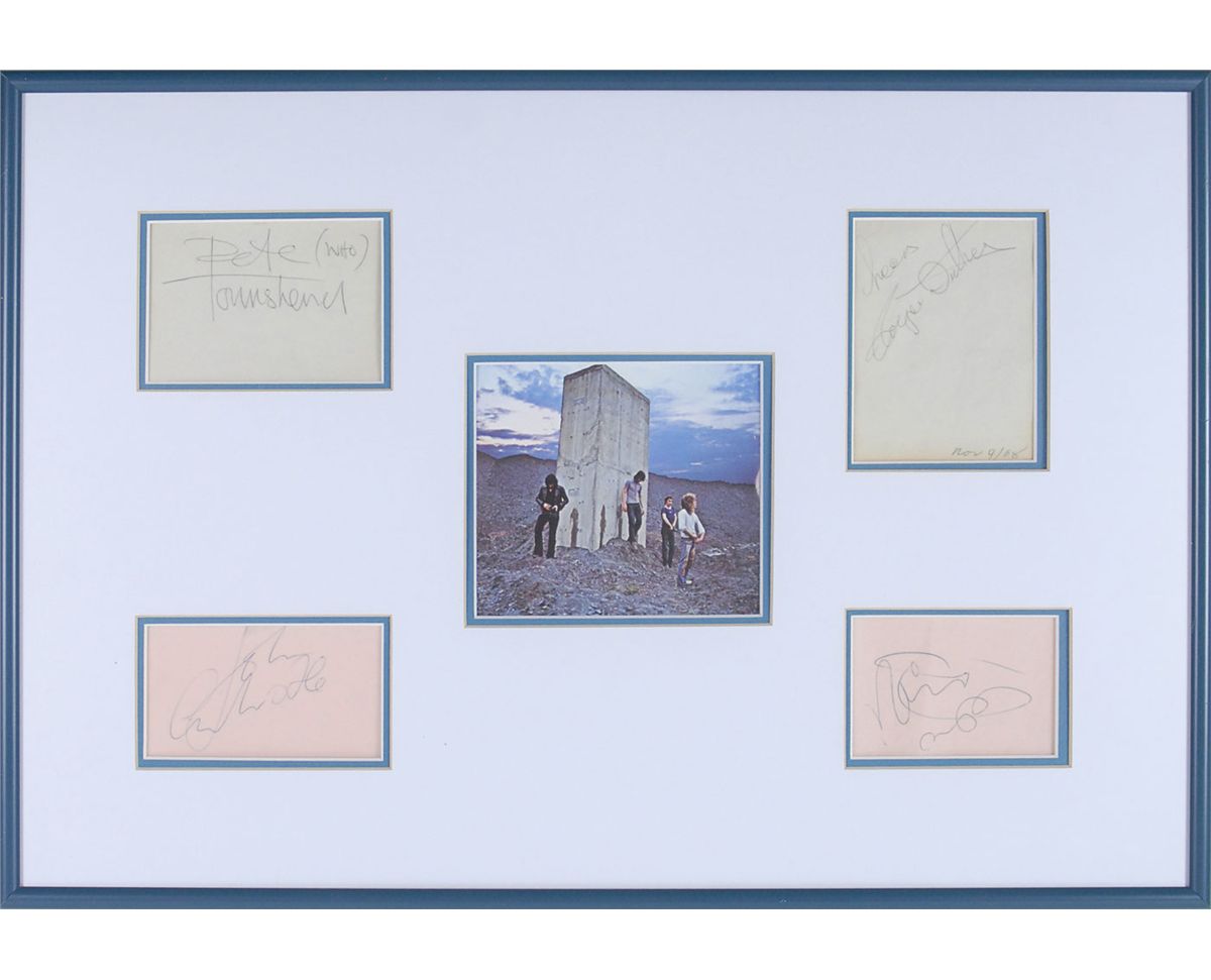 Vintage ballpoint signatures, “Pete Townshend (Who),” “Keith Moon,” “Cheers, Roger Daltrey,” and “John Entwistle” on individual album pages. Nicely double-matted and framed with an image of the Who’s Next album cover to an overall size of 19.25 x 13.25. In overall fine condition, with scattered creases.