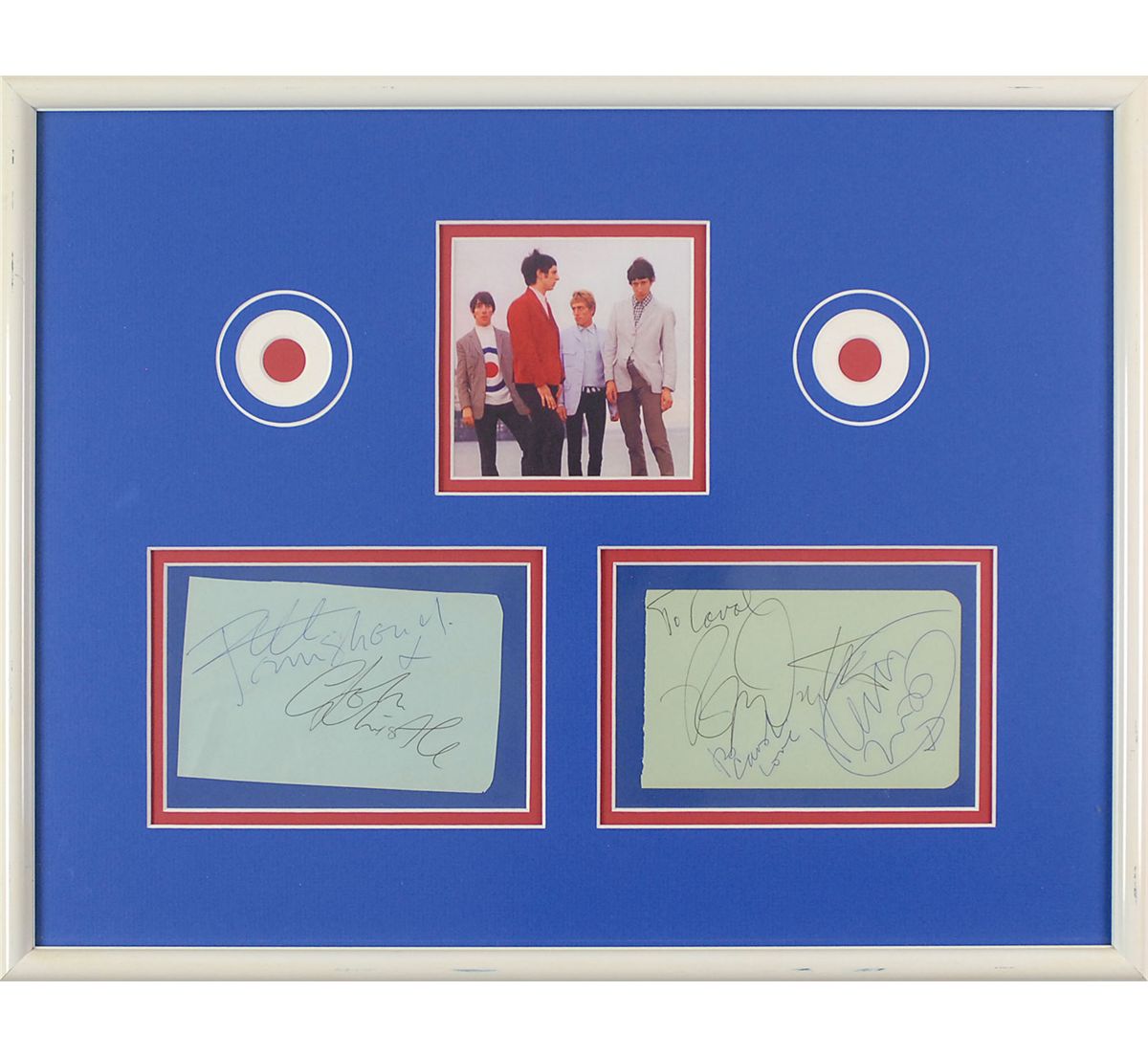 Vintage ballpoint signatures and inscriptions, “To Carol, Love, Keith Moon,” “To Carol, Roger Daltrey,” “Pete Townshend x,” and “John Entwistle,” on two 5.25 x 3.25 album pages. Double-matted and framed with a small color group photo to an overall size of 19.5 x 15.5. In fine condition.