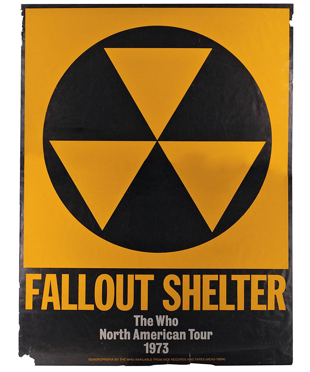 Original 40 x 53 tour poster for The Who’s 1973 North American tour, featuring a large ‘Fallout Shelter’ design. In very good condition, with scattered creases, surface wear, and noticeable edge chips and tears. The tour was in support of their newly released Quadrophenia album and only consisted of 12 shows, beginning on November 20, 1973, and ending on December 6, 1973. This brief tour meant that these posters were printed in limited supply—estimated at around 200—and because of their large size and fragile nature, few examples have survived.