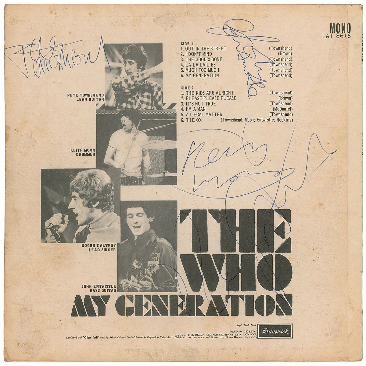 My Generation album signed on the reverse in blue ballpoint by Pete Townshend, Keith Moon, John Entwistle, and Roger Daltrey. In very good condition, with moderate creases and soiling, and several small areas of surface loss (not affecting signatures). The record is not included. This was The Who’s debut album and today is recognized as one of the most important rock albums of the era. Rarely found in this fully signed, uninscribed format, this is an exceedingly desirable piece.