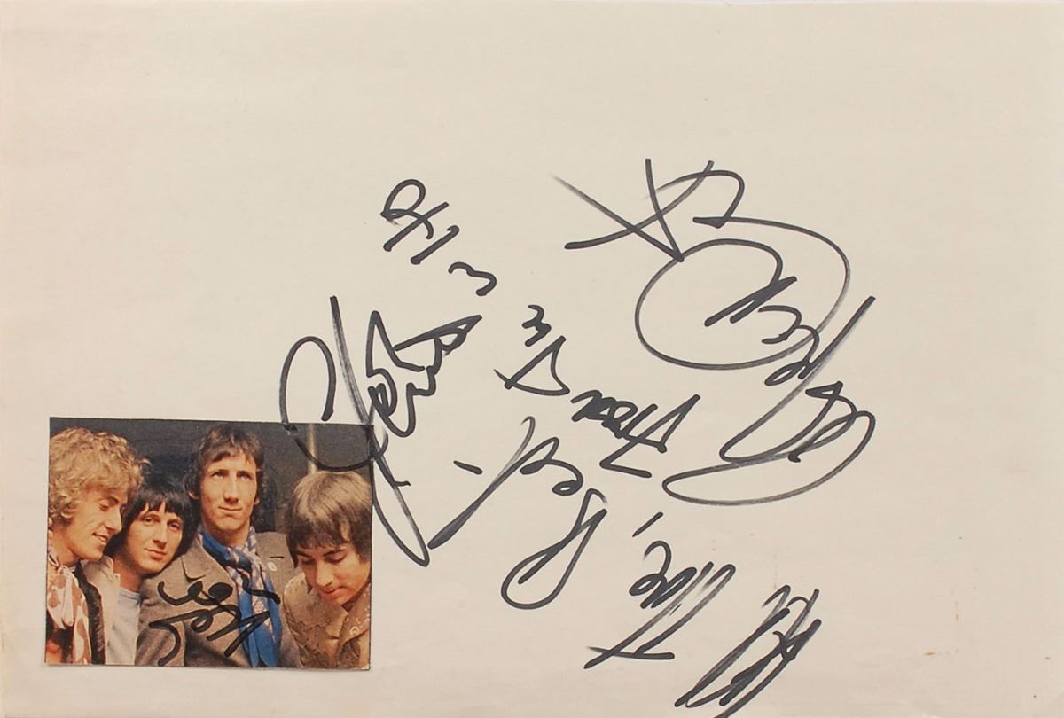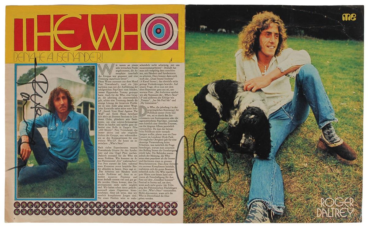 Two items: an off-white 12.75 x 8.5 sheet prominently signed in black felt tip, “All the Best, Cheers from The Who, Roger Daltrey” and “J. Entwistle,” with a small affixed color photo signed “Keith Moon”; and a color 20 x 12 magazine spread, signed in black felt tip, “Pete Townshend” and “Roger Daltrey.” In overall fine condition, with some wrinkling and handling wear. Consignor notes that these vintage signatures were obtained in person in Vienna during the early to mid-1970s.