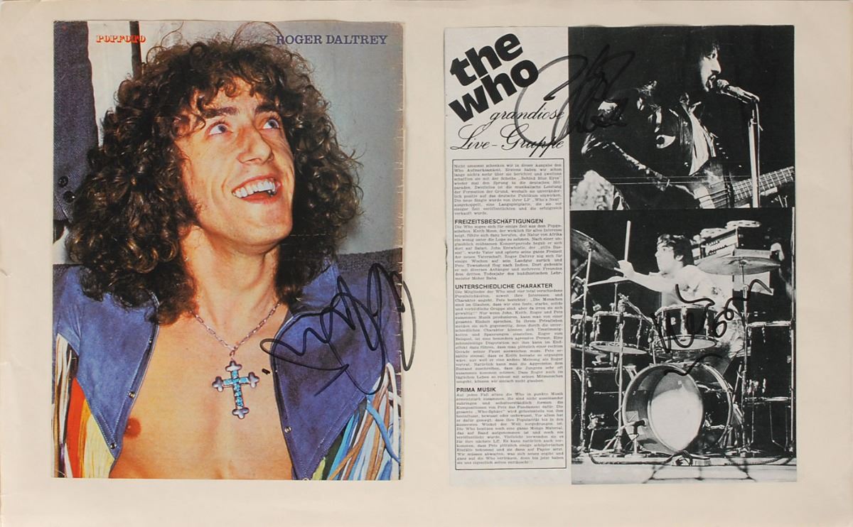 Off-white 20.75 x 12.75 scrapbook page bearing two affixed magazine photos of The Who, signed across the photos in black felt tip by Roger Daltrey, John Entwistle, and Keith Moon. In very good to fine condition. Consignor notes that these vintage signatures were obtained in person in Vienna during the early to mid-1970s.