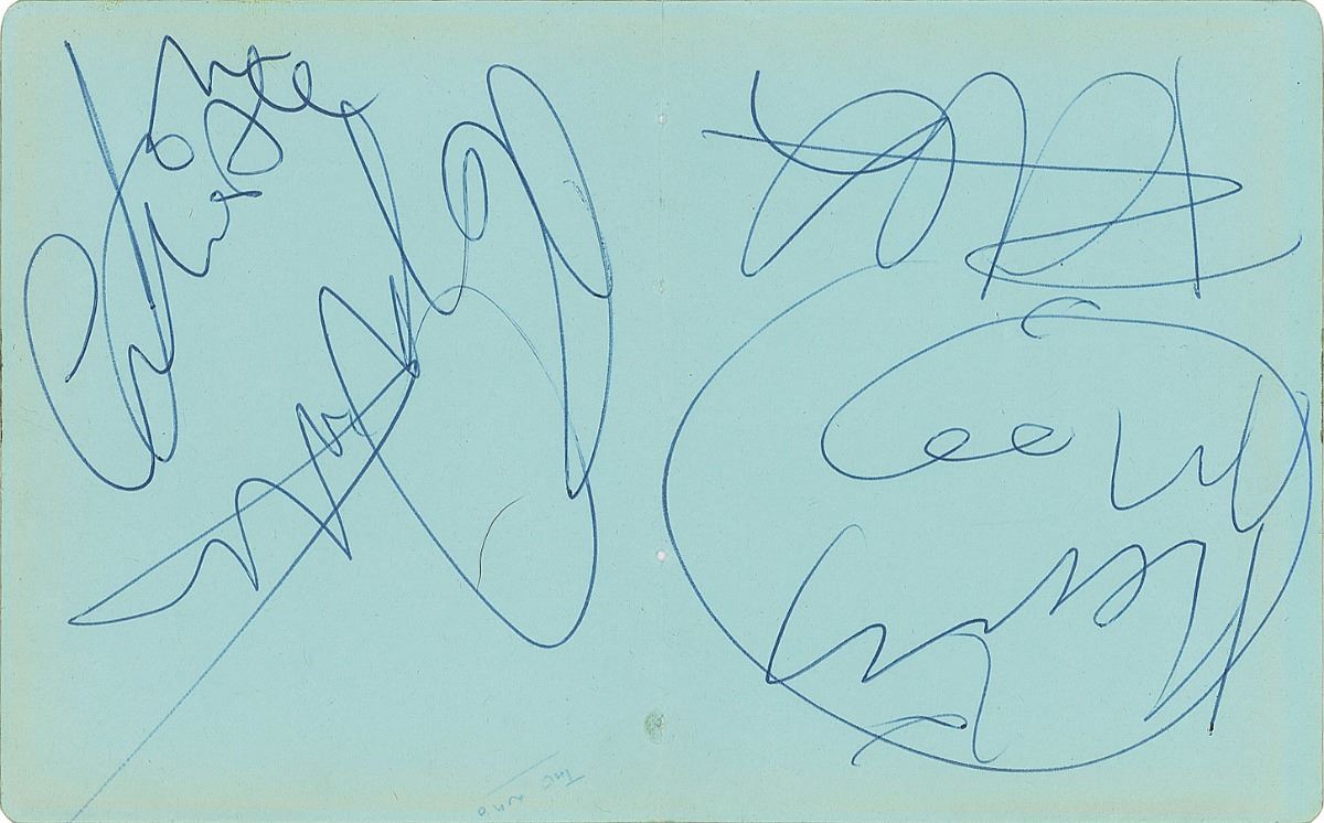 Superb ballpoint signatures, "Keith Moon," "Pete," "Roger Daltrey," and "John Entwistle," on a light blue 7.25 x 4.5 album page centerfold. In fine condition, with small binding holes along the central horizontal fold. A highly attractive and fully signed example. Provenance: Sotheby's, June 16, 1998.
