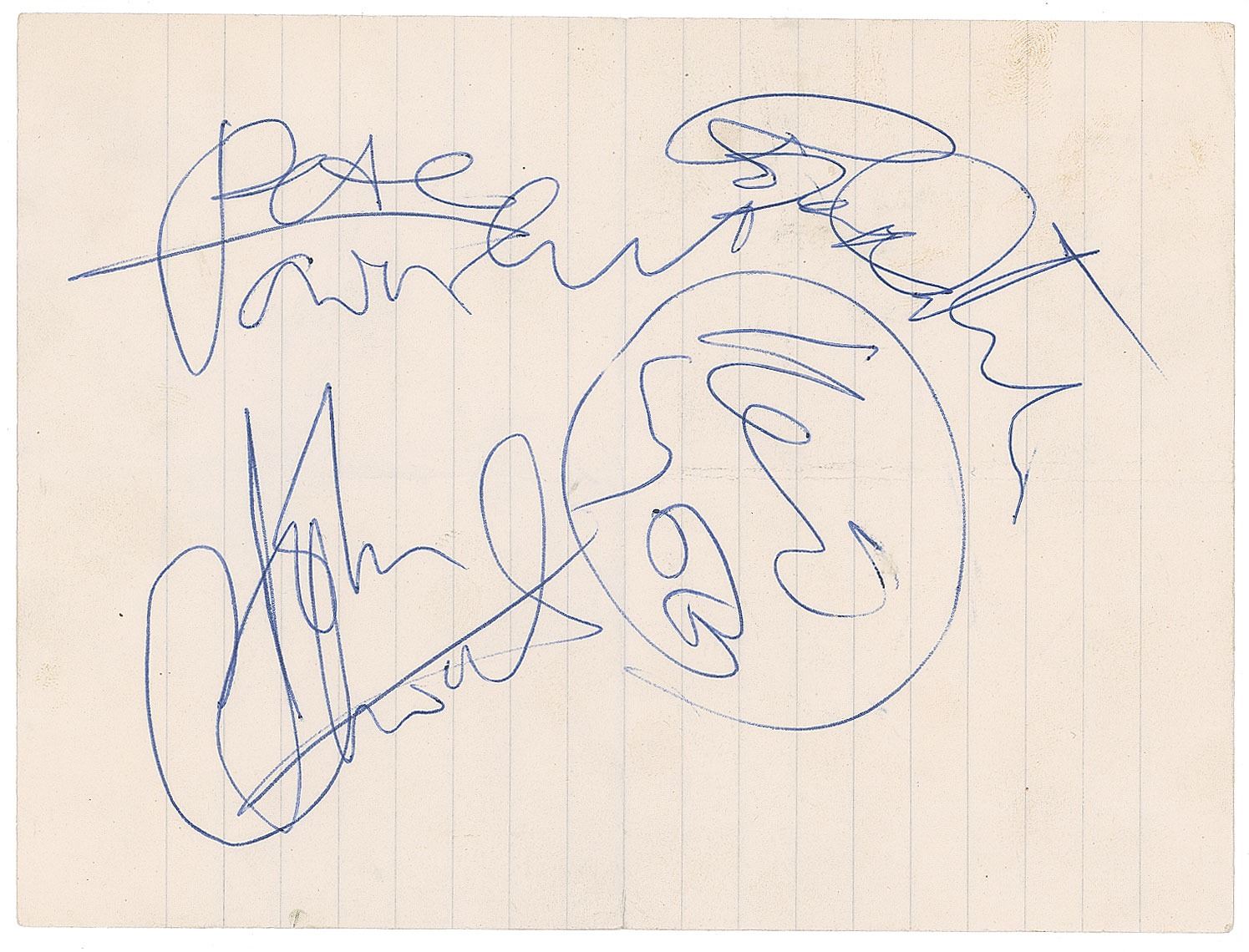 Vintage ballpoint signatures of Roger Daltrey, Pete Townshend, John Entwistle, and Keith Moon on an off-white 7 x 5.25 sheet of notebook paper. In fine condition, with light creasing and intersecting folds. Accompanied by an unsigned publicity photo of The Who, several newspaper clippings, and a certificate of authenticity from Tracks, which notes that the signatures were obtained at the Odeon Theatre in Newcastle on October 30, 1971.