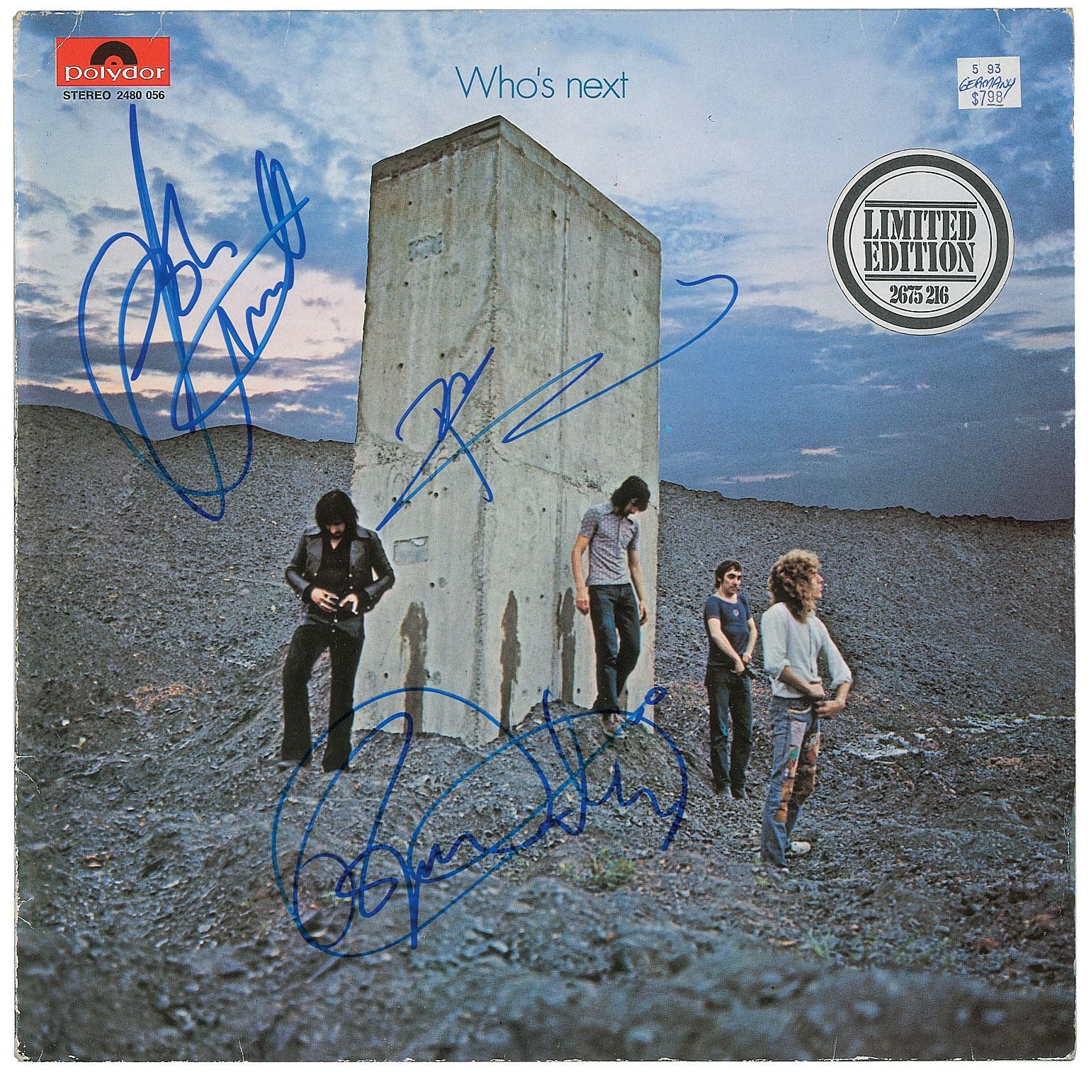 Who's Next album signed on the front cover in blue felt tip by Roger Daltrey, Pete Townshend, and John Entwistle. In fine condition, with light edge creasing, and an affixed price sticker. The record is included.