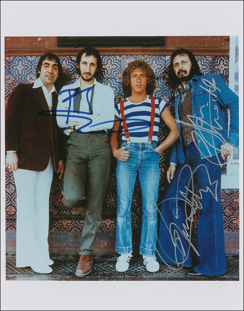 Color glossy 8 x 10 photo of the band in the 1970s, signed in blue felt tip by Pete Townshend and in silver ink by Roger Daltrey and John Entwistle. In fine condition.