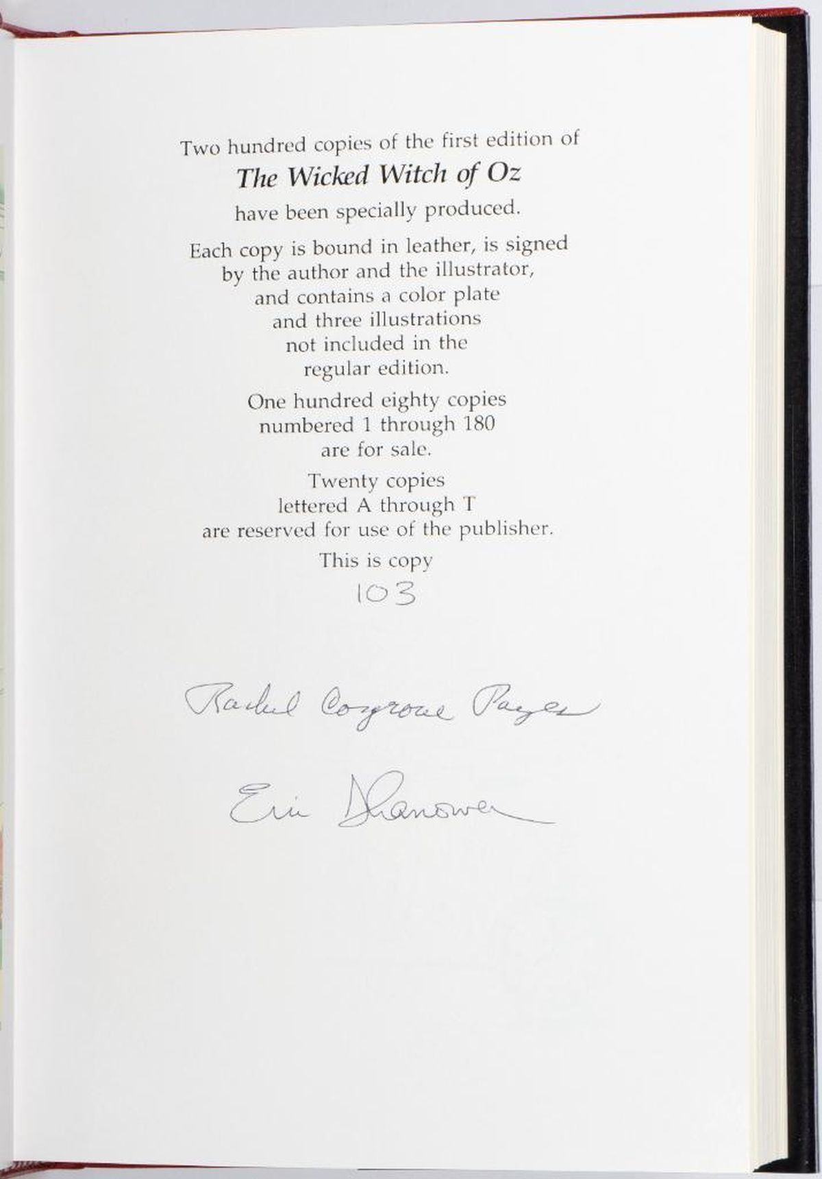 The Wicked Witch of Oz by Rachel Cosgrove Payes, illustrated by Eric Shanower. 1 st signed limited edition 103/180. Fine illustrated hardcover in dust jacket, in matching black & red slipcase. Signed by both Payes and Shanower. Lettered copies created for members of the International Wizard of Oz Club. The last Oz book by a canon€ author, with illustrations by the Eisner award winning Shanower. Fine