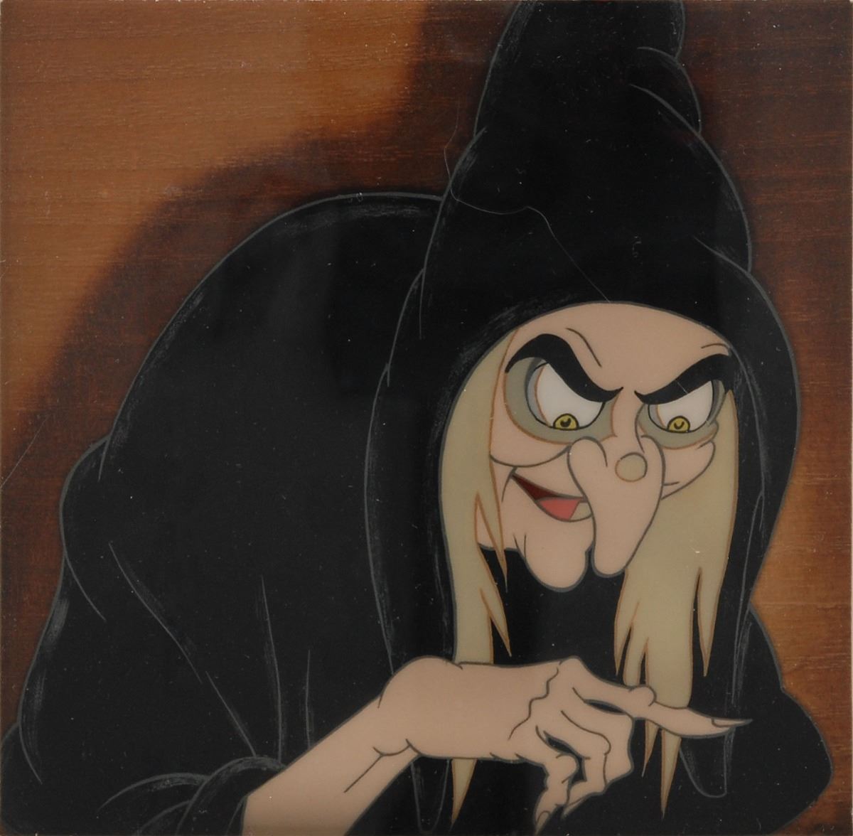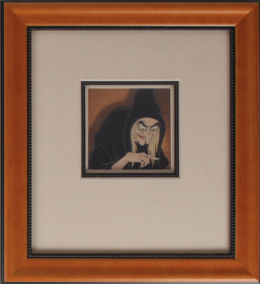 (Walt Disney Studios, 1937) Original production cel featuring the Wicked Witch from Snow White and the Seven Dwarfs, showing her with an evil grin and knobby outstretched finger. The cel has been trimmed and applied to a woodgrain background as prepared by Courvoisier Galleries for sale. Image measures 4.5 x 4.5. Handsomely cloth-matted and framed. In fine condition.