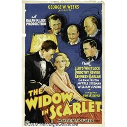 <B>The Widow in Scarlet (Mayfair Pictures, 1932)</B></I> One Sheet (27" X 41"). On a lark of a bet, Baroness Orsani (Dorothy Revier) claims that she can take a diamond necklace belonging to socialite Peter Lawton-Bond and get it back without anyone noticing. As she plots her caper, some jewel thieves have the same idea as the Baroness, minus the idea of eventually returning the necklace. Extensive edge wear on the top edge, with tears and paper loss. Fold wear on the upper horizontal fold, with fold separation and loss of paper. Slight separation on the center crossfold. Slight edge wear and staining on the other edges. This poster has beautiful stone lithographic art with bright colors that pop out at you. Very Good/Fine.