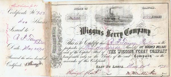 East St. Louis, 1880. Stock certificate for 62.5 shares of The Wiggins Ferry Company. Top center vignette of a small steam ferry. Receipt glued to the left side and pen cancelled, and in fine condition overall.