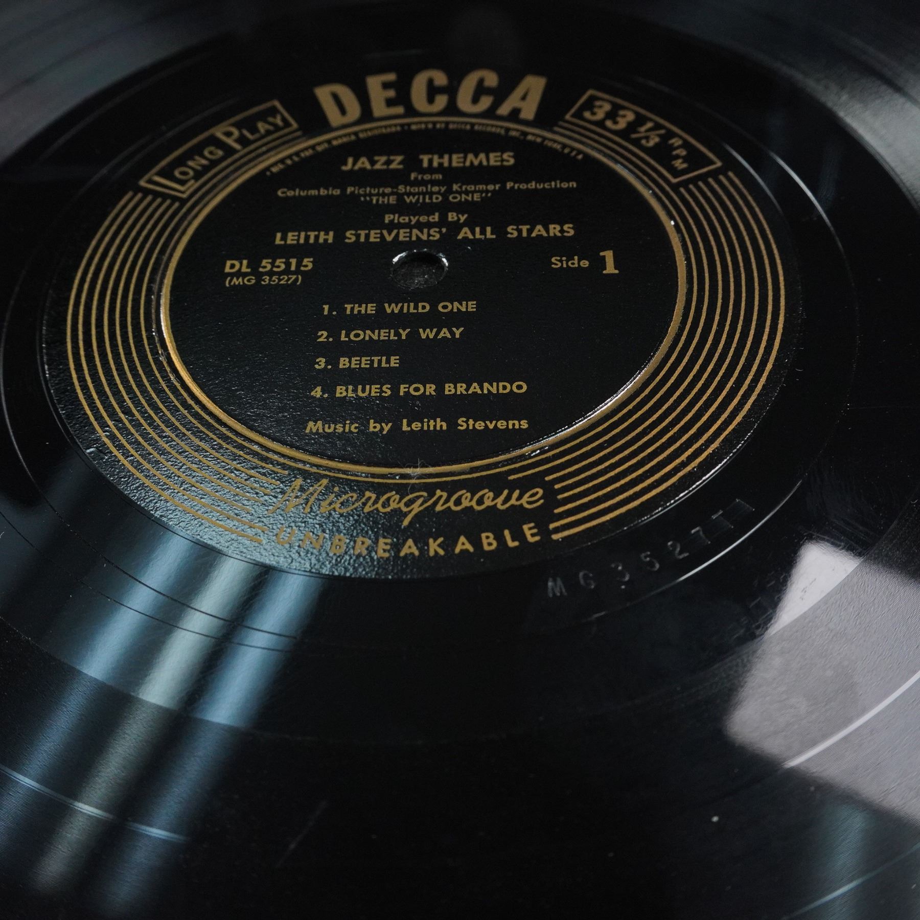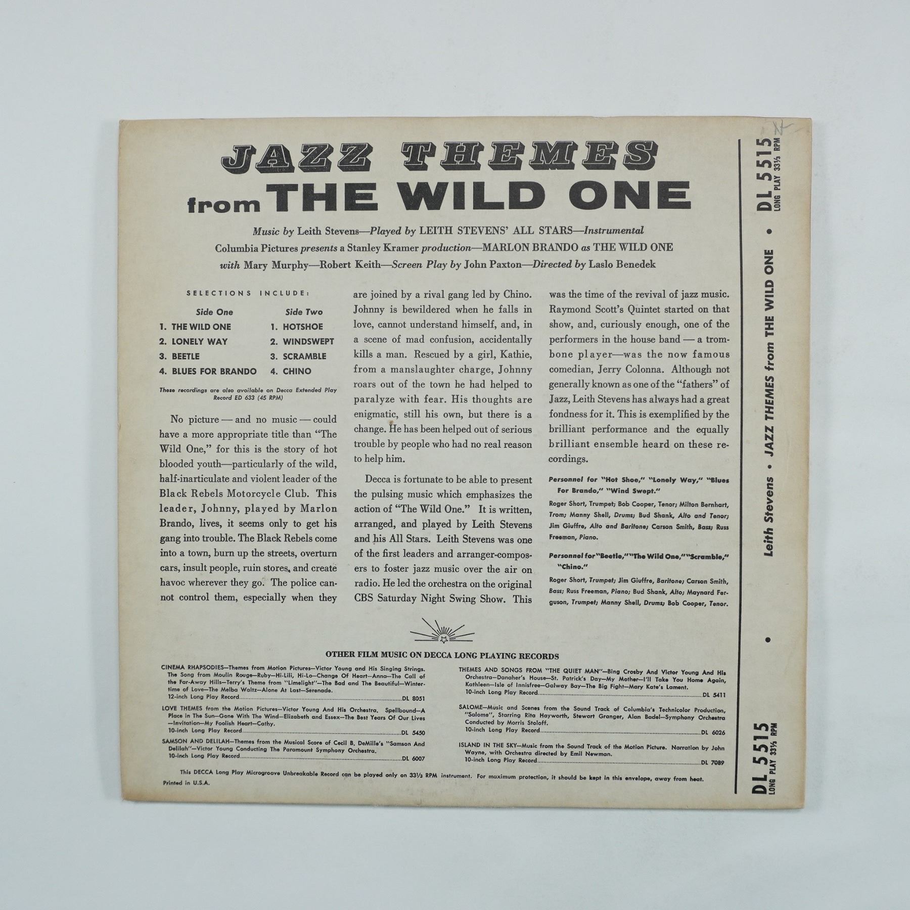 A vintage Decca Records LP titled Jazz Themes from The Wild One, featuring music composed by Leith Stevens and performed by Leith Stevens' All Stars. This album includes iconic jazz themes from the 1953 Columbia Pictures film The Wild One, starring Marlon Brando. The record is a 33 1/3 RPM long-play vinyl with a black and gold Decca label, catalog number DL 5515. The original cover showcases striking artwork related to the film, and the back cover provides detailed liner notes about the music and its connection to the movie.