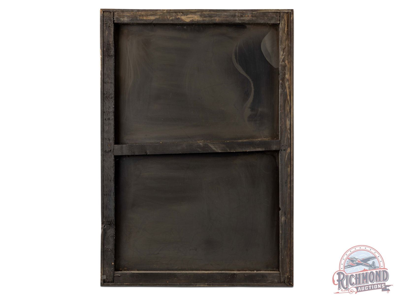 SST (single sided tin) wood framed sign has good color and shine. Presents with general surface wear and a few very mild scratches. The right and bottom edges shows some discoloration that give the piece a great patina look. Mounted in the original wood frame and retains the original American Art Works, Coshocton, Ohio tag at the bottom. 40.5" H x 28.25" W.
