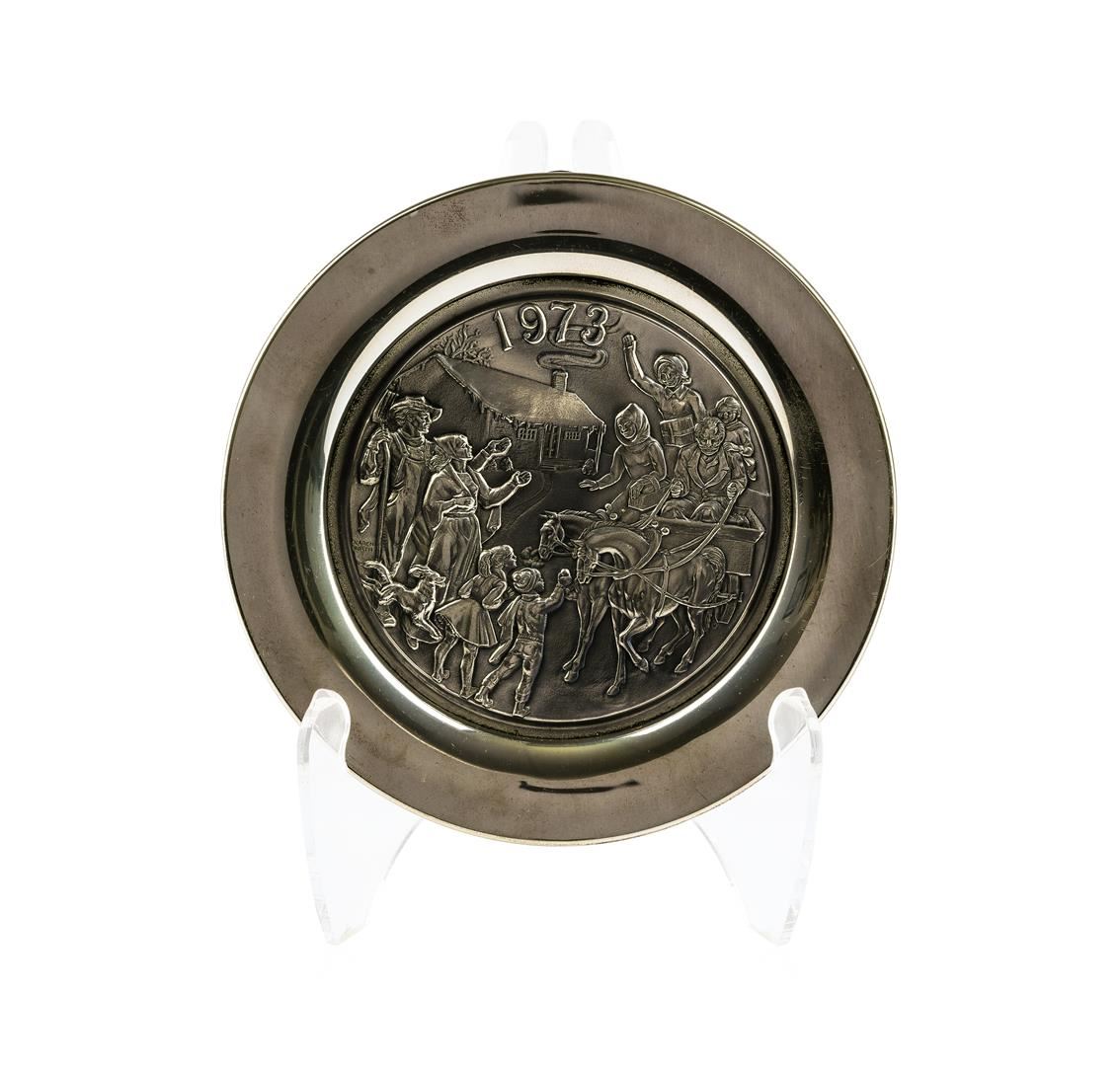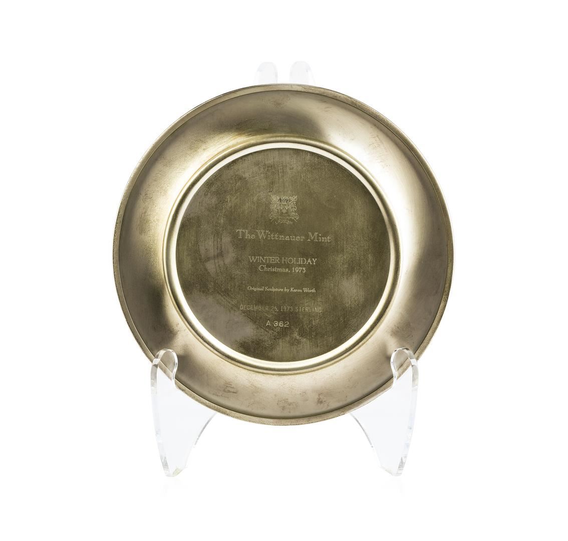 The Wittnauer Mint Sterling Silver "Winter Holiday" Christmas 1973 plate measures 8" around. Weighs 311g.