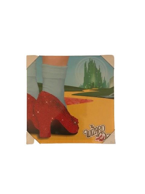 The journey begins Dorothy slipper clad feet take their first steps on the yellow brick road, with the emerald city in the distance in this amazing Wizard of Oz journey to Oz glitter large canvas print. Measuring 15 inches tall by 15 inches wide, and features glitter applied to the canvas so those ruby slippers really do sparkle! Product features a sawtooth metal hanger on the back and comes ready to hang sealed from factory. With original tags still attached.