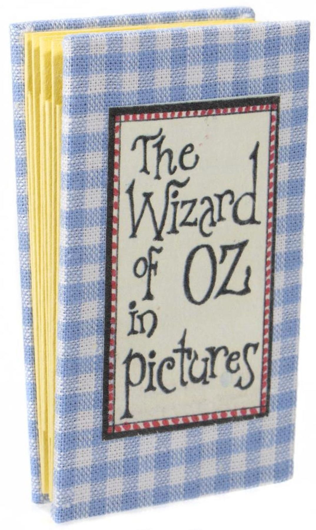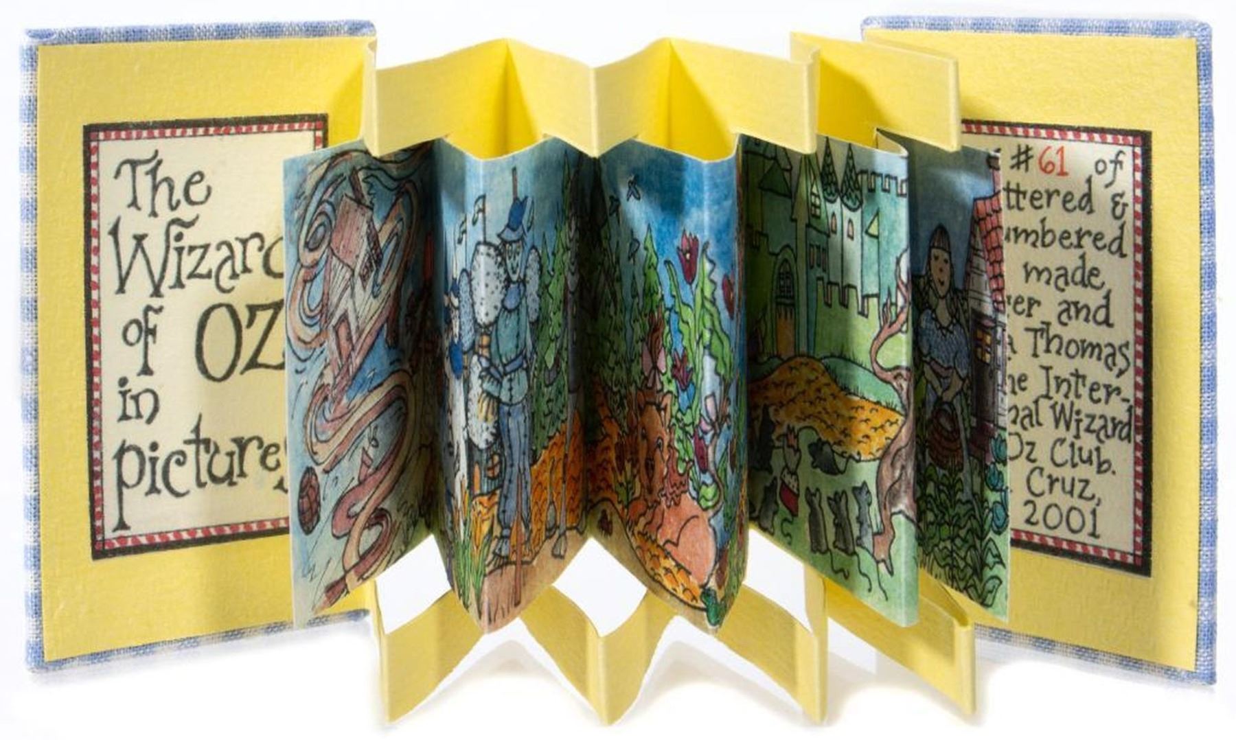 The Wizard of Oz in Pictures, limited edition miniature accordion€ book in blue & white 2 checked Gingham with yellow-brick slipcase. Copy #61 of 75 copies created exclusively for the International Wizard of Oz Club in 2001 by Peter and Donna Thomas of Santa Cruz, California. From the archives of the International Wizard of Oz Club. Fine