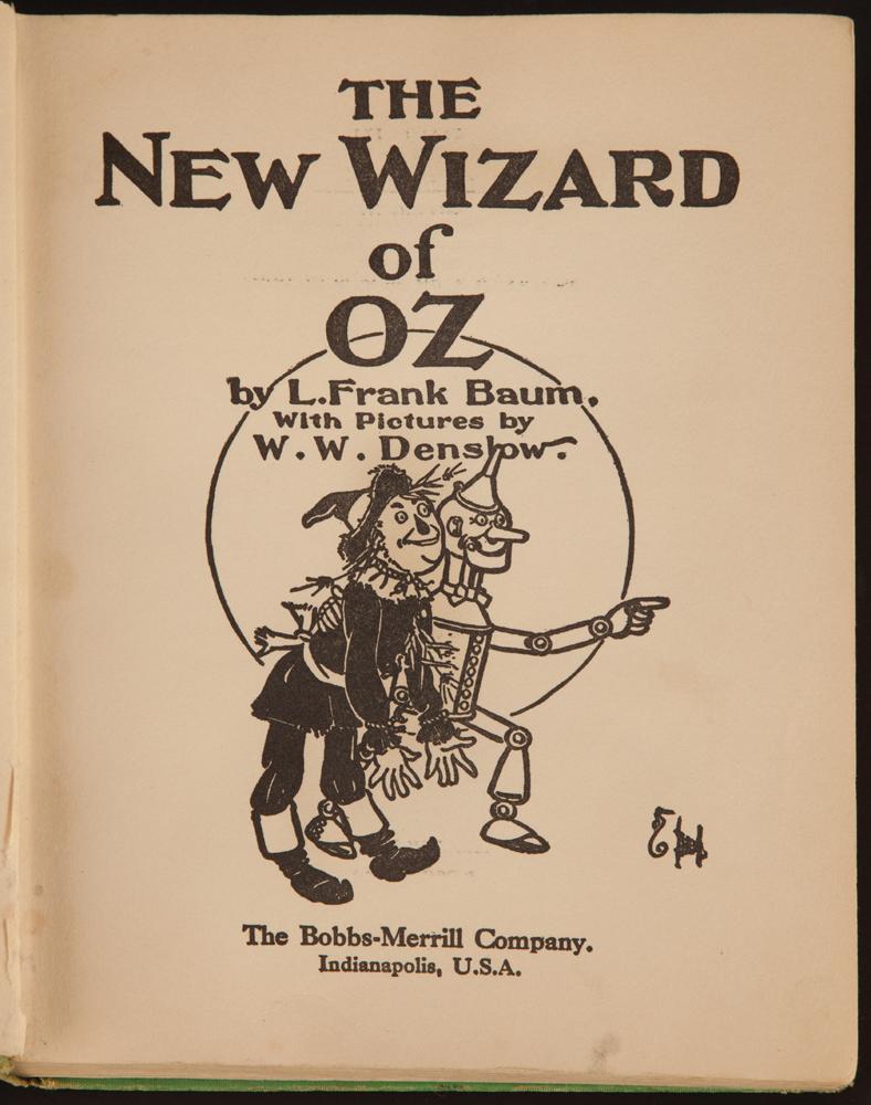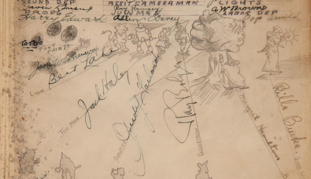 The Wizard of Oz vintage clothbound book signed to Jack Haley’s son by virtually entire cast and crew including Judy Garland and Toto. (MGM, 1939) A well read and much loved copy of the 5th edition, 2nd state early 1930’s clothbound printing of The Wizard of Oz, ex-libris Jack Haley Jr., with his bookplate inside front cover. His father Jack Haley, who so memorably portrayed the Tin Man in the film, brought this copy to the set and had the following sign it for his son, who was 5 years old at the time: cast members Judy Garland, Frank Morgan, Jack Haley, Ray Bolger, Bert Lahr, Margaret Hamilton, Billie Burke, Toto (footprint, with trainer Jack Weatherwax signature); stand-ins Bobbie Koshay, Harry Masters, Frank Remsden, and Francine(?) O’Hanlon; and crew members producer Mervyn LeRoy, director Victor Fleming, Al Shenberg, Keith Weeks, Harold Rossen, Harry Edwards, Gavin Burns, Ray Ramsey, Allen Davey, A.W.Brown, Wm. Cannon, Jack Leonard, Pop Arnold, and 15 others. Front endpaper, which contains the primary signatures, also has detailed pencil drawings of the principal characters linking them to their signatures. All in all, a highly personal, remarkable, and most certainly unique artifact from what many film lovers consider to be the greatest film of all time. Front cover and several of the 8 color plates are wavy and lightly dampstained, and signed pages exhibit scattered foxing; all corners are bumped and abraded, a well-used copy, still Good to Very Good. Together with Jack Haley Jr.’s personal copy of “The Land of Oz”, being a 1930’s popular edition of the sequel to the above mentioned book. From the estate of Jack Haley, Jr. and never before offered for sale.