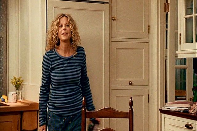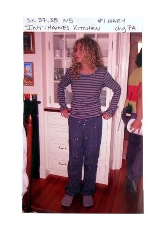 The Women (2008) Mary Hanies (Meg Ryan) Screen Worn PJ Outfit - Meg Ryan delighted audiences when she returned to her roots as the vulnerable girl-next-door heart-breaker in the 2008 all-star remake of "The Women", playing a successful fashion designer going through the trials and tribulations of an unfaithful husband. As her world crumbles around her, she has one of her most wonderful scenes where she "fights back" at the world by gorging herself on a "meal" of a solid stick of butter dipped in chocolate and whip cream! These are her hero screen worn way too cute J. Crew green/blue plaid PJ pants with embroidered "St. Bernard's", and her "Damsel" gray/black horizontal strip cotton shirt that she wears in the scene. It also comes with an original production photo of Meg on the set with the outfit as part of the original production wardrobe tag. Please note that she is referred to as "Ruby Taylor", which was her code name during production to keep the press away!